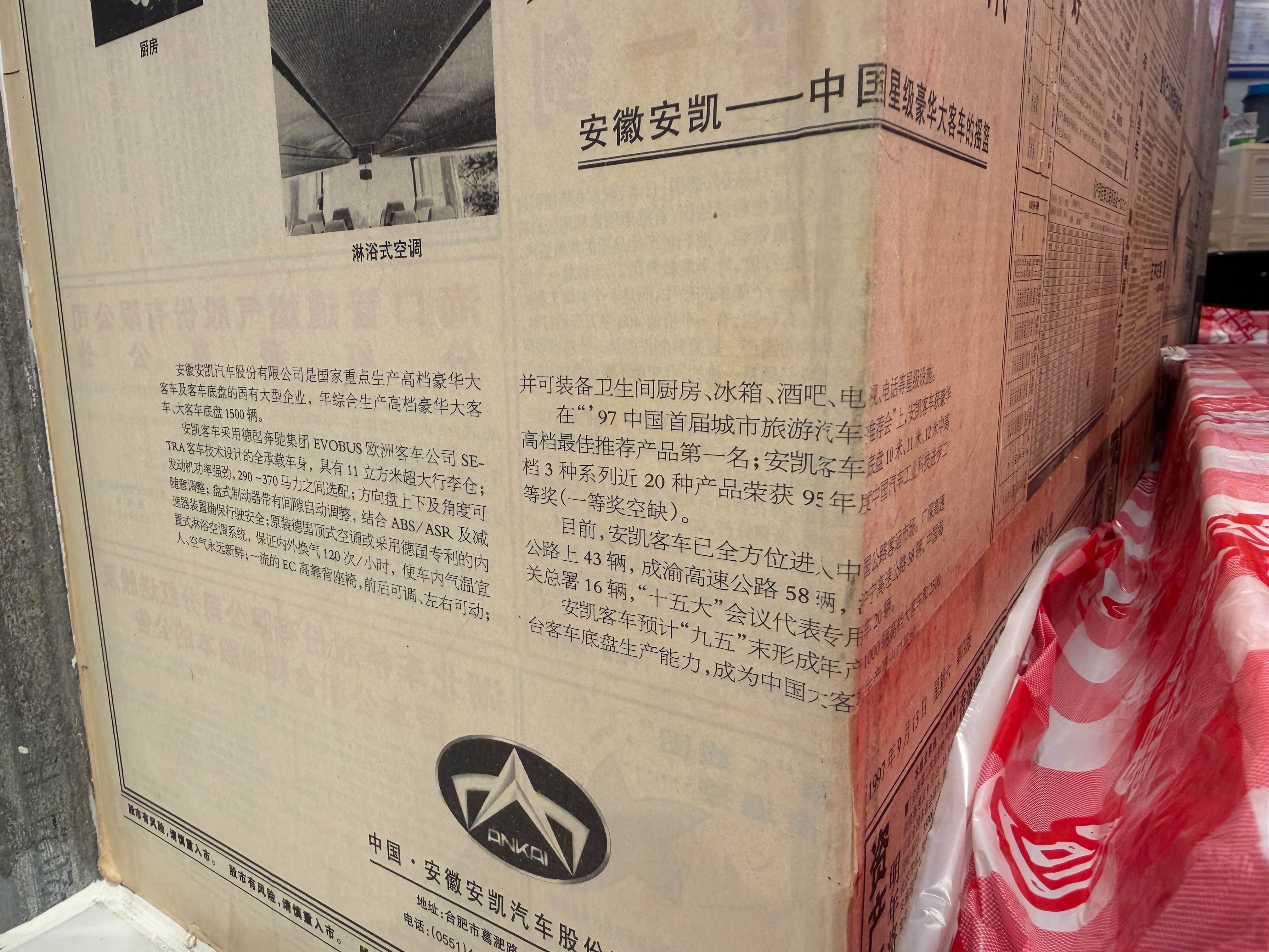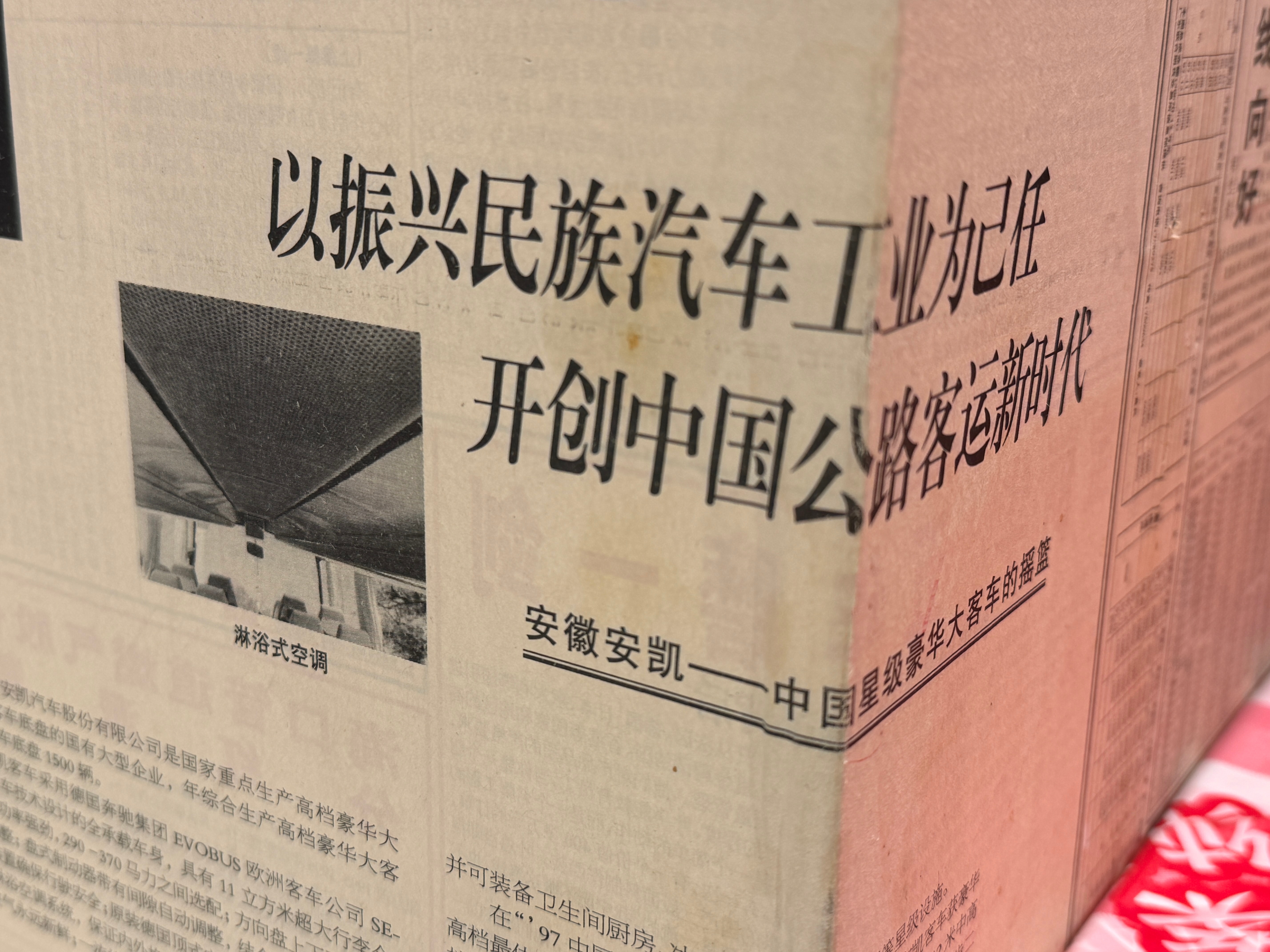 吃饭看到个墙上贴的报纸,是1997年9月15日的。说的是安徽安凯客车,里面有冰箱、闭路电视、厨房、空调95年还获得了中国汽车工业科技进步二等奖(一等奖空缺)我对客车不太了解,现在是不都没有安凯客车了?