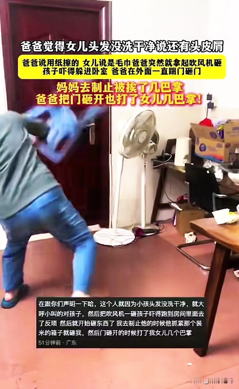 爸爸怀疑女儿用纸巾擦头发暴力打砸! 有这样的爸爸也是种悲哀,女儿也没做错呀!就算用纸巾擦头也没有问题呀?这就受不了开始疯狂打砸啦?严重怀疑他有暴力倾向! 1月26日,据媒体报道,广东一名爸爸在看到女儿吹头发时,看见头上有头皮屑,就误以为女儿用纸巾擦头发,也不问缘由就直接爆发! 手脚齐上场,拿起凳子猛的砸向风扇,再用脚猛踹房门,可谓是“火力全开”,女儿被父亲的操作直接吓懵,迅速跑进房间躲了起来,妈妈上前阻止也被打了几巴掌。 看这位男子的娴熟操作应该也不是第一次了,长期以往肯定给孩子造成了不小心理阴影呀!希望有关部门介入调查严惩这位男子!