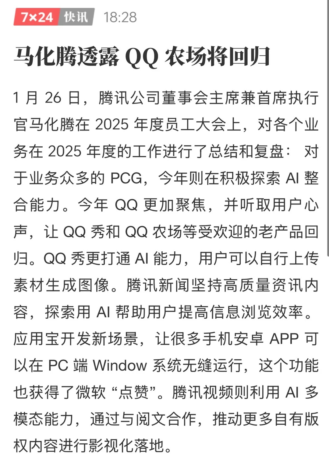 腾讯公司举办2026年会,马化腾领唱“冲冲冲” 激情扔公仔!另外马化腾透露QQ农场/QQ秀即将回归。个人高端怀疑,是不是要无缝移植到微信端…
