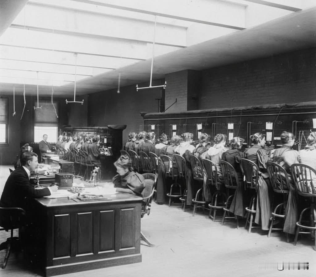 这张照片拍摄于1896年纽约市的一个电话交换局。它展示了早期电话通信技术的重要时刻。 照片中的大多数员工是女性电话接线员,一名主管(阿曼达·希区柯克 (Amanda Hitchcock))坐在桌子前,通过耳机讲话。在自动拨号系统出现之前,客户需要通过接线员手动连接电话线路。 电话在当时还是一项相对较新的革命性技术,由亚历山大·格雷厄姆·贝尔(Alexander Graham Bell)发明仅二十年后。 接线员的工作要求高精度和快速反应,需要手动操作复杂的电线和开关系统。这份工作为女性提供了获得经济独立和向上流动的机会。 这张照片记录了塑造现代通信的早期工作,展示了女性在职场角色转变中的开创性作用。