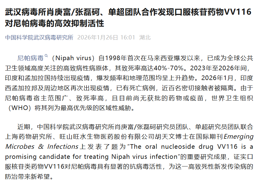 #武汉病毒研究所发现对尼帕有效药物#【#武汉病毒研究所新发现#:口服核苷类药物VV116对尼帕病毒具有显著的抗病毒活性】印度东部的西孟加拉邦近期出现尼帕病毒疫情,引发全球关注!1月26日,中国科学院武汉病毒研究所微信公众号发文称,近期,中国科学院武汉病毒研究所肖庚富/张磊砢研究员团队、单超研究员团队联合上海药物研究所、旺山旺水生物医药股份有限公司胡天文博士在国际期刊发表的重要研究成果,证实口服核苷类药物VV116对尼帕病毒具有显著的抗病毒活性,为这一高致死性新发传染病的防治带来新希望。该成果首次证实VV116对尼帕病毒的治疗潜力,不仅可作为医护人员、实验室工作者等高危人群的预防性用药,更可为应对当下和未来的尼帕病毒疫情提供了一个现成的药物选择。#中国从未发生一例尼帕病毒感染#
