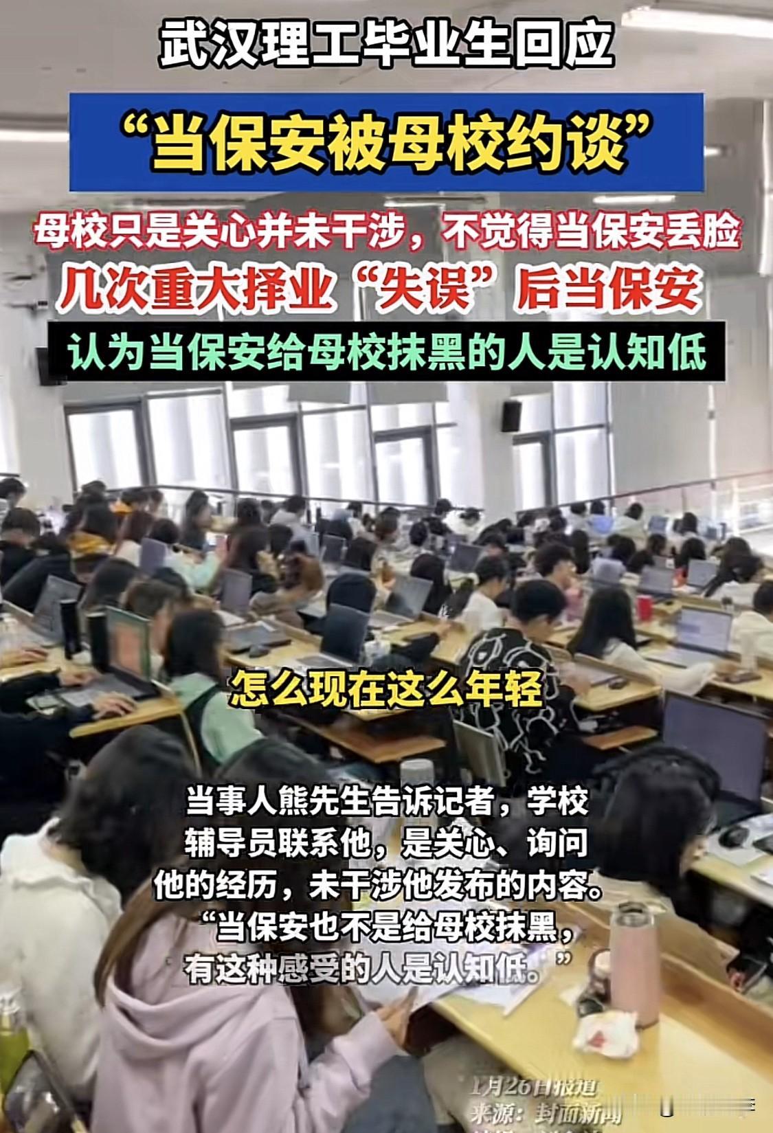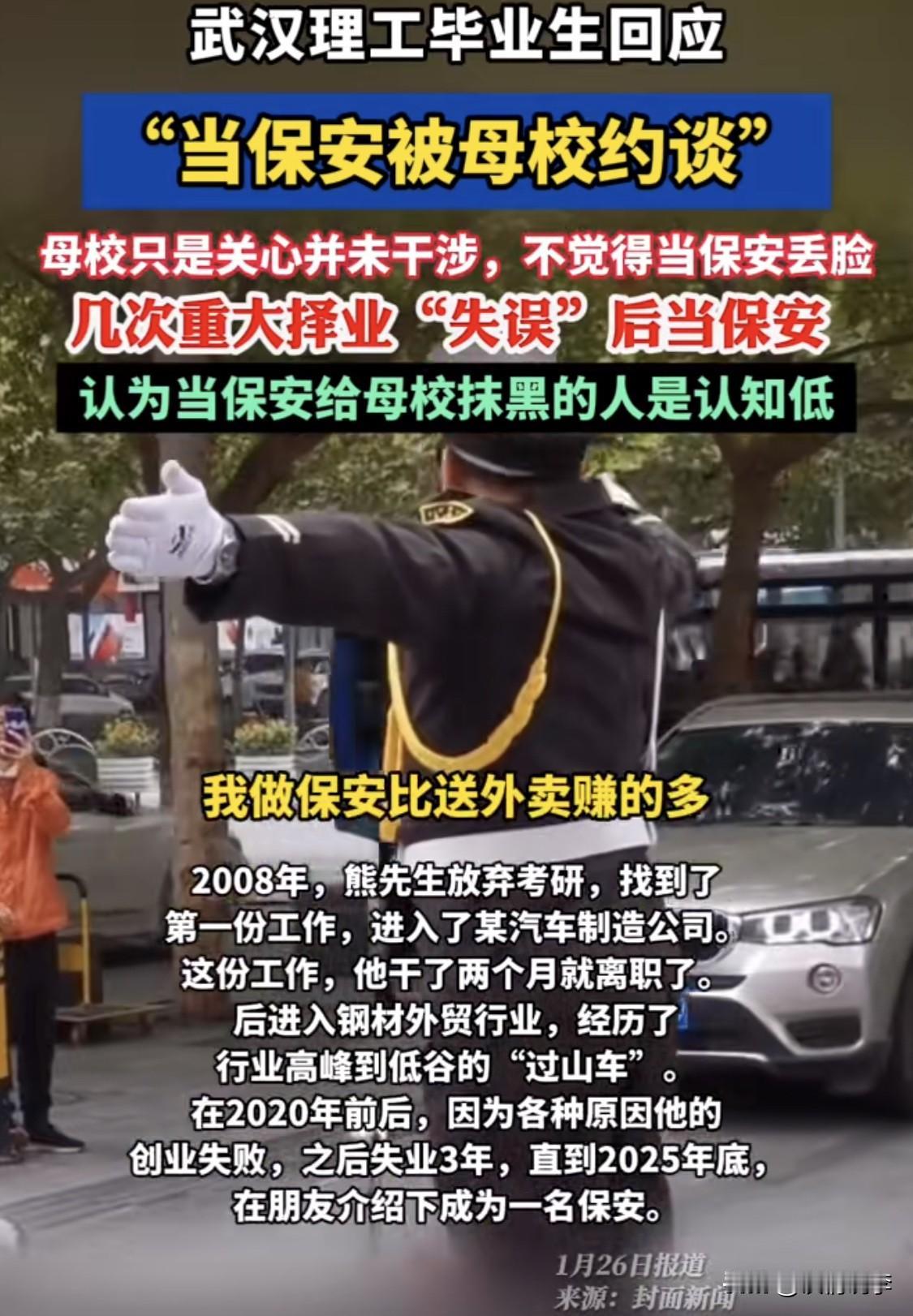 太平洋的警察,管得可真宽! 今天看了武汉理工大学毕业生的回应,看得人真是无语啊。毕业于武汉理工大学的熊先生,突然接到母校辅导员的电话询问,说是“关切”,辅导员表示不理解,问他“怎么做保安了呢?” 言下之意很明显,你堂堂一个武汉理工大学的毕业生,怎么会去做这种底层人民才干的工作呢?这不是给学校抹黑吗?咱们武汉理工大学出来的应该都是精英呀!不应该是保安!保安是不需要读大学的! 熊先生说,2008年,他放弃了考研,找到了第一份工作,、入职某汽车制造公司,两个月离职。之后进入钢材外贸行业,再次跌入谷底。之后又经历了创业失败,然后失业3年。熊先生痛定思痛,当了一名保安。他在当保安之余通过网络讲自己的工作弯路经验,没想到视频火了,被母校武汉理工大学看到了,网传他被母校约谈。 熊先生回应说,母校只是关心并没有干涉他。他同时认为,他做保安比送外卖赚得多,当保安也不是给母校抹黑,有这种感受的人是认知低。 生活首先是生下来活下去,在活不下去的时候,先就业,有一份稳定的工作,能养家糊口,这没有什么不对的。再说在如今的就业形势下,竞争激烈,能有一个工作很不容易了,退一万步说,干保安很丢人吗?那么环卫工也丢人,都别干了。