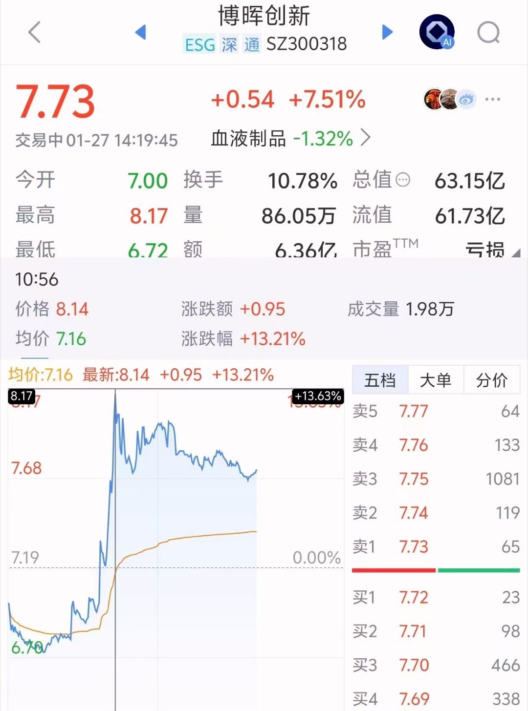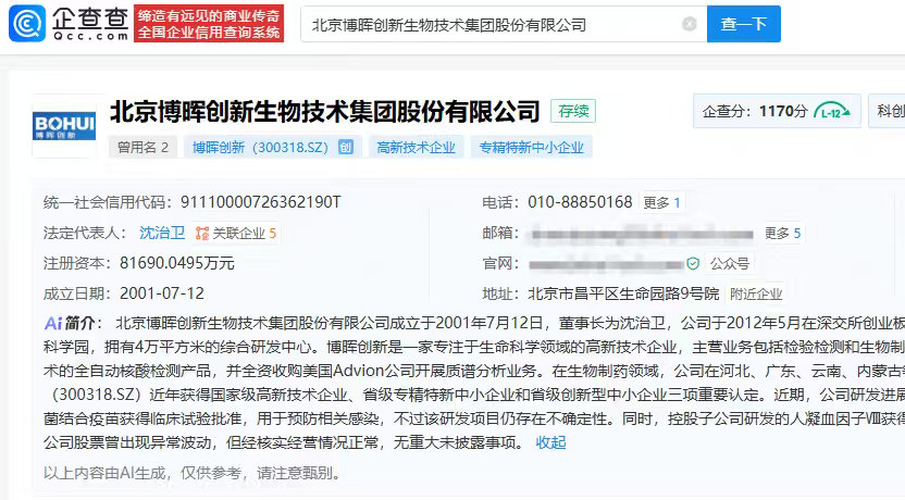 【#博晖创新盘中大涨#】#揭秘推出尼帕病毒核酸检测盒公司# 1月27日,媒体报道博晖创新自主研发“尼帕病毒核酸检测试剂盒(荧光PCR法)”,搭配BHQ-III全自动核酸分析仪器系统的解决方案,为病原监测提供关键数据引发热议。搜索发现,1月27日,博晖创新盘中大涨,一度涨幅超10%,截至14点10分,最高报8.17元/股。企查查APP显示,北京博晖创新生物技术集团股份有限公司成立于2001年7月,注册资本约8.17亿元人民币,于2012年5月在深交所创业板上市。目前,该公司经营有甲型流感病毒、乙型流感病毒、呼吸道腺病毒、呼吸道合胞病毒抗原联合检测试剂盒(免疫荧光法)、全自动核酸检测分析系统等商品。此外,博晖创新大股东杜江涛关联有内蒙古君正能源化工集团股份有限公司、博晖生物制药(河北)有限公司、北京理工大学教育基金会等企业/社会组织。#中国公司推出尼帕病毒核酸检测盒#