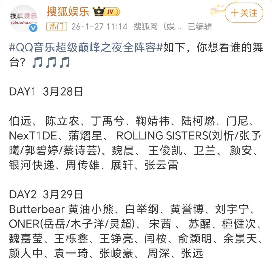 QQ音乐巅峰之夜官宣阵容,再就业团去了四个,唯独缺少老大和老幺! 3.29号的QQ巅峰之夜,苏醒,王铮亮,张远和王铄鑫都有出席,唯独缺少了第一名陈楚生和第十三名陆虎。 陈楚生2026年的荒芜之境升级版很快就要开启,陆虎之前说是接了一个活儿,时间还挺长的,很难再和兄弟们搭档了。 兄弟们的发展各不相同了,很难看到他们在这样的晚会上合体了。不过能看到这四个站在一起也是很拉风的场面了,披哥四人组再次来袭,期待一下吧!再就业男团 苏醒