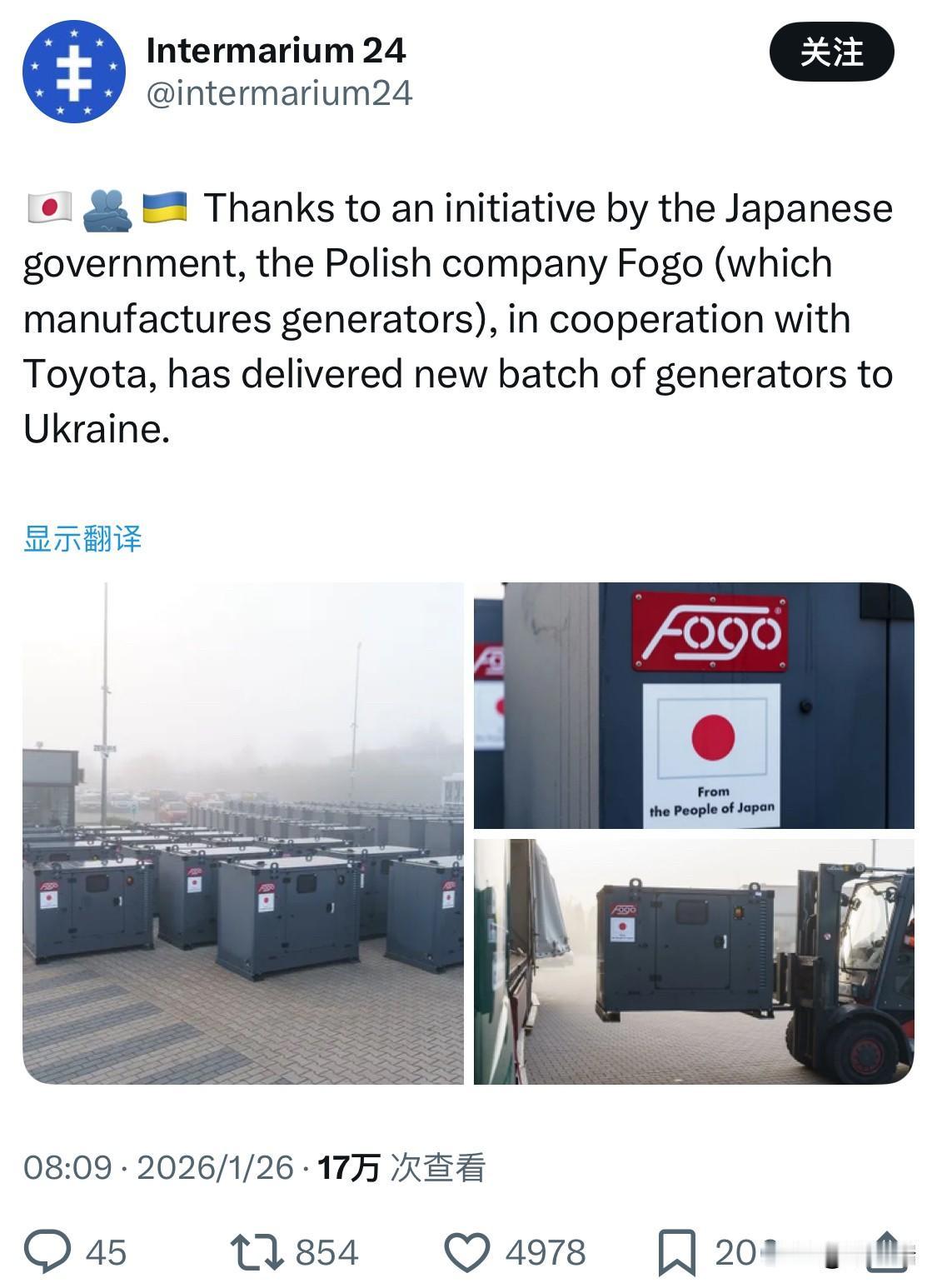 根据2026年1月的最新消息,波兰发电机制造商 Fogo 公司在日本政府的倡议下,与丰田(Toyota)合作,向乌克兰交付了一批新的发电机。 Fogo 与丰田的合作性质:在日本政府的推动下,Fogo 与丰田合作生产并交付发电机,以应对乌克兰在严冬期间面临的严重电力短缺。 具体供应:在2026年1月26日交付给基辅的130台发电机中,包括了 20 台 FOGO FV20000 系列(20 kW)和 108 台 FOGO F12000 系列(12 kW)发电机。