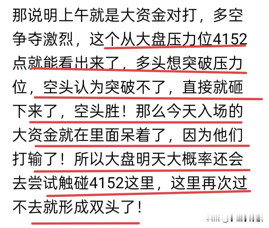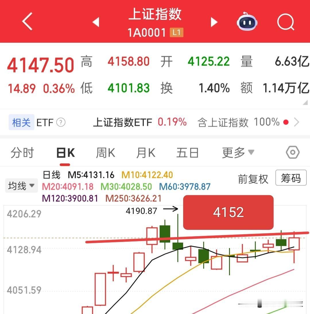 好了,快收盘了,暂且说一下明天的看法吧! 我们看大盘,大盘的压力位大家还记得吧,也就是4152点,今天这里有没有站稳,昨天冲击回落,今天再次冲击又回落,还有最后一次机会,也就是明天如果再冲不过去,那么大盘大概率就要走双顶了形态了! 当然大盘不是我们必看的,预判它只是想知道它什么时候会走双顶,我们还是要看全A这里! 今天收了一根长下影线阳线,但是我们并不能无脑去看多,长下影线阳线并不一定是止跌信号,还需要一次回打,也就是说明天全A能够再次收一根小阳线并且不破十日线,才算是暂时企稳! 所以就很简单,不要无脑加仓,也不要重仓,有利润就T,全是超短投机选手,都是先手割后手,缩量轮动加速,操作难度很大!