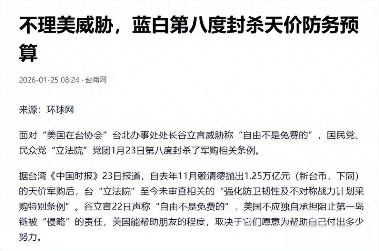 预算卡了第八回,蓝白联手封杀,民众算起安全账 2026年1月23日,台湾地区民意机构再次进行投票,以55票对48票的结果第八次否决了民进党提出的1.25万亿新台币防务特别预算,该预算从2025年11月提交以来一直未能进入实质审查阶段,蓝营和白营直接阻止其推进,这并非出于技术问题或金额大小,而是各方越来越认为这笔支出并不合理。 这笔钱表面上说是防务费用,实际上更像是提前支付给美国的款项,公开资料显示它用于购买火箭、导弹和炮弹,但好几项关键内容被列为机密,谁都查不到具体细节,更关键的是,这笔预算与台湾和美国之间的关税谈判、企业外迁、对美投资承诺捆绑在一起,简单来说,就是台湾方面先答应让出利益,美国那边才表示可以考虑支持,这种模式一旦开始,以后可能每年都要交钱,没人能保证只收一次。 就在表决前一天,美国在台协会负责人突然说自由不是免费的,这话听着有道理,但时间点太巧,结果第二天美国新发布的国防战略报告里根本没提到台湾,同一时间特朗普还跟国防官员一起合影,显得很热闹,岛内很多人看到后直摇头,觉得对方连正式文件都不敢写台湾的名字,却要台湾掏万亿新台币,这种逻辑根本讲不通。 老百姓也开始不买账了,有人把支持安全等同于必须通过预算,这让人反感,质疑政府花钱是民主社会的基本权利,怎么一提反对就扣帽子呢,这两年为了换美方一句安全承诺,台湾让出不少产业利益,税收也松了口子,现在大家开始算细账,考虑安全值不值这么多钱,美方反复强调台湾要自己负责,从来没签过协防协议,一边喊你倚美,一边连书面保证都不给,等于让人光着身子站街上喊口号。 最尴尬的是,所有决定都是台湾自己做的,大陆根本没有参与进来,后果却要本地人承担,教育、医疗、养老的钱被挪走,填进这个无底洞,美国既不管资金怎么用,也不对结果负责,有意思的是,2025年12月国台办曾经点名指出这笔预算有敛财的嫌疑,台湾的主流媒体居然没有反驳,这说明连内部人员也觉得心虚。 我们看这几件事的时间线,2025年3月特朗普被问到是否保卫台湾,他没回答;到2026年1月美国战略报告把台湾内容删掉了;接着在1月23日预算又被削减第八次,这三件事连起来说明,美方不想做出承诺,台湾没有谈判筹码,民众也不愿继续买单,以前那种出钱换保护的做法现在越来越难维持了。 有人觉得这是政治斗争,但更多人只是不想吃亏,钱可以花出去,但要清楚用在什么地方、为什么用、用了有没有效果,现在钱还没开始动,大家已经失去信任了。