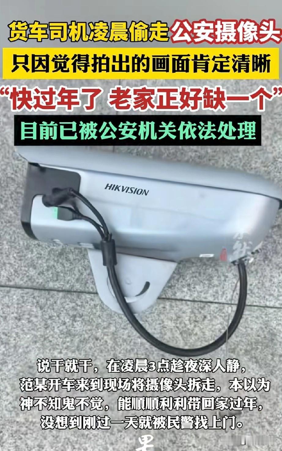贼胆包天!浙江诸暨,一货车司机看见路边电线杆上装着公安部门的摄像头,他想着公家的东西质量指定好,拍出来的画面绝对清晰,便想偷回去,趁着过年装到老家用。凌晨三点,他全副武装很快得手,本以为自己干得神不知鬼不觉,万万没想到,第二天就悲剧了。 范某是一名货车司机,每天靠拉货,收入很不错,谁知,看着老实巴交的他,竟脑子一热,干了件让人哭笑不得的事。 前几天,他经过一个路口,见路边电线杆上装着一只公安部门的公共监控摄像头,而且这摄像头安装高度比较低。 范某心想,公家的东西都是好东西,这监控拍出来的画面指定清晰,快过年了,老家正好缺个监控摄像头,要是能把这个拆回去装老家,那可太合适了。 这念头一起,他越想越觉得是个“好主意”,于是,开始行动了。 凌晨3点,夜深人静,路上基本没人了,范某觉得时机已到,便开着他的渣土车就来到了那个路段。 他小心翼翼地把车停在被盗地点附近,然后鬼鬼祟祟地下了车,开始动手拆摄像头。 他提起应该做过不少功课,所以行动相当快,几下就拆完了,然后迅速回到车上,一脚油门就驶离了现场。 他满心欢喜,觉得自己做的神不知鬼不觉,就等着过年回去把摄像头装上,以后家里就安全多了。 可他没想到,第二天上午,派出所的巡防民警在辖区路面正常巡逻的时候,突然发现那处路边电线杆上的公共监控摄像头不见了。 民警当时就愣住了,公安部门的监控也有人敢偷,这人胆子也太肥了吧! 民警立刻联系所内指挥室,同步查看周边公共视频展开调查。 通过回看公共画面,他们发现凌晨3点左右,一辆渣土车在被盗地点停留了一段时间,随后车辆就驶离了。 而且这辆嫌疑车还故意遮挡了车牌,这给民警的侦查带来了不小的阻碍。 不过,办案民警并没有气馁,他们根据车辆行驶轨迹,结合路面信息,一层一层地排查。 经过一番努力,终于锁定了渣土车司机范某的身份信息及居住地址。 当日下午,民警马不停蹄地赶到范某家中,成功将其抓获,还当场查获了被盗的监控摄像头。 范某看到民警的那一刻,整个人都懵了。 本以为自己做的天衣无缝,没想到才过了一天,就被民警找上门了,简直是神速。 范某胆子也忒大了,公安的东西也敢偷,不知道他咋想的。 有网友爆料称,之前他们单位大门口的两盆大盆景,半夜被人开个三轮车给拉走了,而且对面就是公安局,第二天领导觉得这事儿太丢脸了,都没报警。 还有前几年,有个笨贼更离谱,胆大包天地把公安局大门口的金字招牌上“公安局”几个字给偷走了,他以为是金的,想拿去卖钱呢。 不过,也有人调侃说,这不叫盗窃,叫盗用,因为偷来的东西不是拿来卖而是自己用,批评几句就行了。 有个地方有人偷电动车,警察叔叔就是这么处理的,批评教育,他知道错了就行了,没必要上纲上线。 目前,范某因涉嫌盗窃公私财物,已被公安机关依法处理。 无知者无畏,范某一点也不冤,公安的监控摄像头都敢偷,明摆着就是往枪口上撞,也算长个教训。