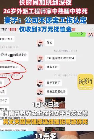 “牛马不如!”河南开封,26岁男子在睡梦中猝死,妻子认为丈夫死的蹊跷,怀疑是在公司经常加班经常加班到深夜,疲劳过度导致的。气愤之下,要求认定为工伤,公司承担责任,没想到,公司只给了30000元抚恤金就没下文了。妻子委屈的说:我还有50多万房贷没还呢! 现在很多人的工作早就没了准点,陈先生的遭遇就是个典型例子。 他是名审计员,干的是劳务派遣的活儿,没有固定工位,半年里被来回派往北京、湖北等地。 刚入职他就跟乔女士吐槽工作量太大,可想着家里刚背上的50多万房贷,他只能咬着牙扛。 从10月到12月,加班成了陈某的常态,晚上10点、11点甚至凌晨一两点,工作群里还能看到他和同事沟通的消息。就算周末回开封家里,电脑也从不离身,有时候忘了带电脑,临时有工作就得跑去附近网吧加班。 有次周六手机没电关机,领导直接发微信质问“电话关机?”,那种无形的压力,让他连喘口气的机会都没有。 事发前一天,也就是1月17号周六,他还在家接了好几个工作电话,谁能想到这竟是他最后的工作痕迹。 陈某每月7000块左右的收入,是这个小家的全部支柱,基本工资才3000,剩下的全靠补贴和绩效拼出来。 可他倒下后,公司的做法寒透了人心。19号派人送来3万块抚恤金,之后就没了下文。乔女士想为丈夫申请工伤认定,毕竟人是被活活累垮的,可公司直接说了不愿意,连坐下来好好谈的态度都没有。 后来乔女士在社交平台发了丈夫的加班记录,引来网友关注,公司却逼着她把帖子隐藏了,这哪是解决问题的样子,分明是想捂住盖子。 这事看着是个例,其实藏着太多打工人的无奈,尤其是劳务派遣的员工,简直成了权益保障的“边缘人”。 按规定,劳务派遣员工出事,该由劳务派遣单位申请工伤认定,用工单位得帮忙核实情况,工伤保险责任也该由派遣单位担着。 可真出了事,这些规定就成了空架子,派遣公司和用工单位互相踢皮球,最后受伤的还是死者家属。 更让人憋屈的是工伤认定的门槛。法律说在工作时间、工作岗位突发疾病死亡,或者48小时内抢救无效的才算工伤。 可陈某是在家睡梦中猝死的,虽然医生说了和长期加班有关,但就因为不在“工作岗位”上,认定工伤就难上加难。 每年过劳猝死的人里82%都和长期加班有关,可工伤认定成功率还不到30%,这规矩简直是给企业留了空子钻。 再说说那3万块抚恤金,简直是打发人。要是能认定工伤,光一次性工亡补助金就有108万多,再加上丧葬补助金和供养亲属抚恤金,怎么也能帮乔女士撑起这个家,还上那50多万房贷。 可公司就拿3万想了事,这不是欺负人吗?他们心里门儿清,只要不认定工伤,就不用掏这笔钱,哪管孤儿寡母以后怎么活。 现在多少人的工作跟陈某一样,没了准点,没了边界。领导一个电话,不管周末还是深夜,都得立马响应,手机不敢关机,电脑不敢离身。 企业总把“奋斗”挂在嘴边,可奋斗不是拿命换啊!尤其是劳务派遣的员工,没保障、没归属感,被当成人肉工具来回调度,出了事就成了“外人”,这也太不公平了。 乔女士现在和婆婆相依为命,对着空荡荡的新房子,看着房贷账单,哭都哭不出声。她就想讨个公道,可公司连面都不露。 这事儿根本不是3万块能解决的,是企业对生命的漠视,是劳务派遣制度执行中的漏洞,是普通打工人维权太难的现实。 那些天天喊着“以人为本”的企业,真该好好看看陈某的聊天记录,看看乔女士手里的死亡证明,摸摸自己的良心。 这种现象不是一天两天了,多少人被加班压得喘不过气,却因为要养家糊口不敢反抗。企业钻法律空子,把风险转嫁给劳动者,劳务派遣成了“甩锅神器”,工伤认定的条条框框又卡得那么死,最后受苦的都是最底层的打工人。 陈某的命,不能就这么被3万块打发了,他的遭遇得让更多人看到,劳务派遣的权益漏洞得补,企业的责任得扛,打工人的命得金贵点。