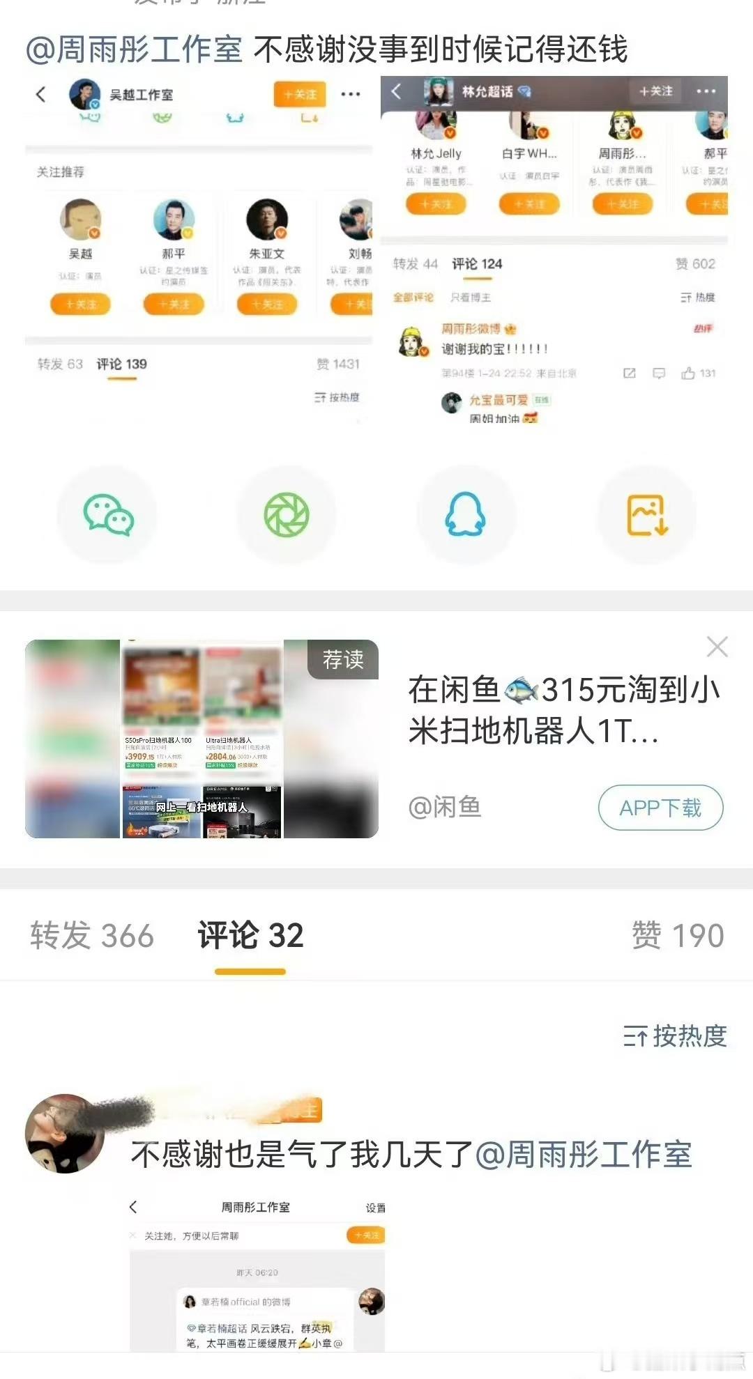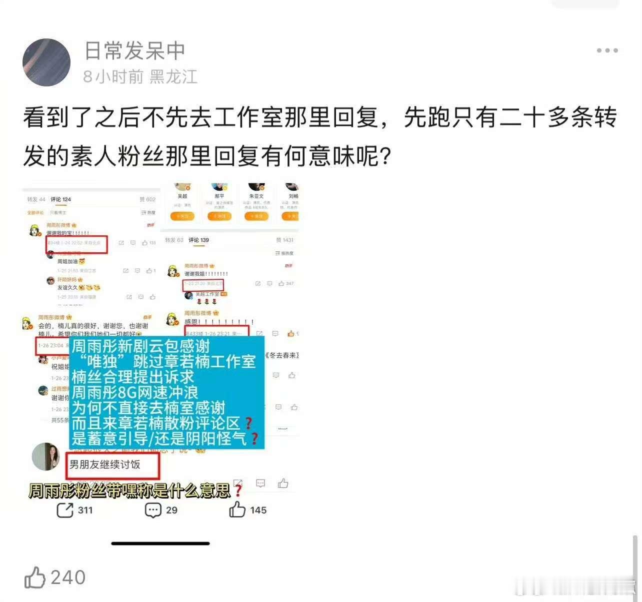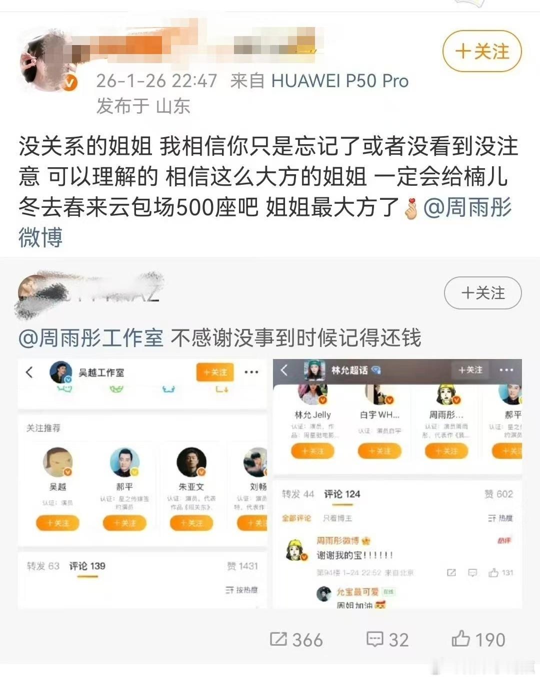 周雨彤这个情商真的太低了吧章若楠包场周雨彤的《太平年》,周雨彤回复了帮她包场的其他人,就是没有回复章若楠,然后被章若楠粉丝追着要说法,现在跑去回复了章若楠的粉丝…之前上综艺就因为情商不行,还被网友集体抵制过,现在又来这个???