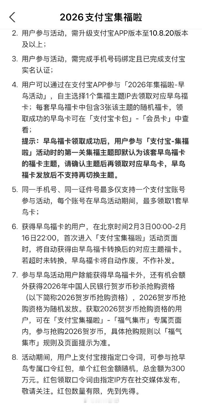 支付宝集福1.27-2.2 可以领取一套早鸟卡,2.3 转换为对应的福卡,玩法基本和去年一样。现在集福也就是凑个热闹罢了,谁真正在意那几块钱,而且以我多年集福的经验,最后几天弄反而更容易。