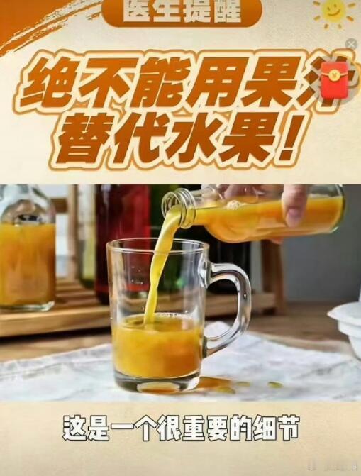 很多人都不知道,同样的苹果,直接吃和榨汁喝,到底有啥不同?我告诉大家,营养成分基本没有区别,最大的问题就在于,吃苹果会有一个咀嚼的过程,嚼碎之后的体积也是很大的,一两个苹果吃下去基本就饱了;但是榨汁喝下去,基本就没有饱腹感,会不自觉的多拿几个苹果榨汁。这样一来,摄入的糖分就远远超标了,如果你血糖本来就偏高,那榨汁的方式就更不适合你。另外,大家也不要信那些榨汁机厂家的宣传,不存在什么“营养更好吸收”,那都是营销噱头。老老实实的吃水果,永远是最可靠的选择。医生提醒绝不能用果汁替代水果多喝果汁和吃水果一样吗