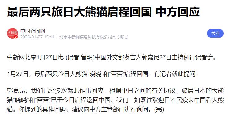 日本最后两只大熊猫即将回国,为了留住它们,一名日本前议员想出了一招。 日本前议员杉村太说让日本民众带着热情向中国请愿,还提到就算中国不喜欢高市早苗首相,也别牵连普通民众,毕竟大家都真心喜欢大熊猫。 这话听着实在,也点出了关键问题,说到底,大熊猫本来是中日友好的象征,现在之所以要如期回国,问题根本不在普通民众身上,而在日本政府的所作所为。 杉村太藏这话算是说到了点子上,普通日本民众对大熊猫的喜爱是真真切切的。 这些年,大熊猫在日本就是 “国民明星”,上野动物园因为有大熊猫,每年都能吸引大批游客,周边的熊猫文创产品卖得火热。 据估算,“晓晓” 和 “蕾蕾” 一年就能为日本创造 308 亿日元的经济效益。还有不少日本民众成了大熊猫的忠实粉丝。 有人坚持每天去动物园打卡,为大熊猫拍了上千万张照片,甚至出版了摄影集,把它们当成了自己的孩子一样牵挂。 这种跨越国界的喜爱,本来是拉近中日民众距离的好纽带,中国从来都看在眼里,也十分理解这份心意。 但要搞清楚,大熊猫的租借从来都建立在两国友好相处的基础上,1972 年大熊猫首次赴日,就是为了纪念中日邦交正常化,是带着传递友好的使命去的。 可看看现在高市早苗政府的所作所为,完全是在破坏这份友好基础。自从上台后,高市早苗在对华问题上越来越强硬。 尤其是在台湾问题上频频说三道四,公然声称中国对台湾使用武力可能构成日本的 “存亡危机事态”,暗示自卫队可能介入,这种干涉中国内政的言论,严重伤害了中国人民的感情。 不仅如此,她还推动增加国防预算,拉拢美国等国家对华施压,导致中日关系持续紧张。 中国出于维护自身利益的考虑,采取了一系列反制措施,而大熊猫租借到期后如期回国,也是这种紧张关系下的必然结果。 杉村太藏让民众请愿,想法是好的,但找错了方向。真正能影响大熊猫去留的,不是民众的热情请愿,而是日本政府的态度和行动。 中国从来不会把对外国政府的不满牵连到普通民众身上,这是我们一贯的立场。 但问题的关键在于,高市早苗政府的错误言行已经破坏了中日友好的氛围,让大熊猫租借所依赖的友好基础不复存在。 如果日本政府真的想让大熊猫继续留在日本,想让这份友好纽带延续下去,最该做的不是让民众请愿,而是正视自身问题,纠正错误的对华政策,停止干涉中国内政,重新回到中日友好相处的轨道上来。 高市早苗政府现在倒是想靠民众对大熊猫的喜爱来缓和舆论,却不愿反思自己的所作所为,这种做法实在不负责任。 之前因为她的强硬对华政策,日本的水产品进口被暂停,稀土供应也面临风险,相关企业损失惨重,不少日本民众已经走上街头抗议,要求她下台。 现在又想借着大熊猫的事做文章,让民众向中国请愿,本质上还是在转移国内矛盾,逃避自己的责任。 说到底,中国从来都珍视中日民众之间的友好情谊,也理解日本民众对大熊猫的不舍。但友好是相互的,不能只要求中国顾及日本民众的感受,而日本政府却一再伤害中国的核心利益。 杉村太藏的提议虽然体现了对大熊猫的喜爱,但终究解决不了根本问题。想要让大熊猫再次回到日本,让这份友好延续下去,日本政府必须拿出实际行动。 摒弃强硬对华路线,尊重中国的核心利益和重大关切,重新构建中日友好相处的基础。否则,就算民众请愿再热情,也改变不了现状,毕竟破坏友好的是日本政府,该做出改变的也应该是他们。