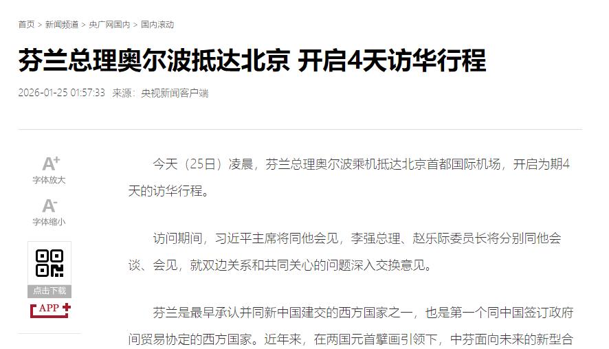 1月25日,芬兰总理抵达北京,不得不说他的访华行程真的很有意思。 英国首相斯塔默早就放出了访华风声,结果被奥尔波抢先一步。 更少见的是,作为西方国家领导人,他一待就是4天,还带着20多家芬兰企业的高管团,摆明了不是来走个过场,而是奔着实打实的经贸合作来的。 可能有人会问,芬兰一个北欧小国,为啥这么急切地要抢在英国前面访华? 其实答案很简单,在当前乱糟糟的国际局势下,谁先抓住和中国合作的机会,谁就能先拿到发展的主动权。 芬兰心里门儿清,现在全球经济下行压力大,欧洲更是被各种麻烦缠身,一边要应对美国关税政策带来的冲击,一边要承担军费激增的财政负担,老百姓的生活成本也一个劲地涨。 这种时候,和中国这个稳定的大市场深化合作,无疑是最务实的选择。 奥尔波带着庞大的企业团来,可不是随便凑数的。这些企业涵盖了机械、森林工业、清洁能源、食品等芬兰的优势领域,都是冲着中国市场的巨大机遇来的。 要知道,中芬合作的底子本来就厚,芬兰是最早承认新中国的西方国家之一,也是第一个和中国签订政府间贸易协定的欧洲国家。 到2025年,两国的双边贸易额已经超过80亿美元,双向投资存量更是突破230亿美元,在全球化逆流涌动的当下,这份成绩单实属难得。 这次访华,双方不仅要签署加强创新企业合作的备忘录,企业间还会敲定不少商业协议,说白了就是要把合作的盘子再做大。 更值得琢磨的是,芬兰这次抢滩访华,也透着对当前国际格局的清醒认知。 这些年,美国对欧洲的态度越来越不靠谱,一会儿批评传统盟友,一会儿又打格陵兰岛的主意,甚至还削弱对欧洲的安全承诺,让欧洲国家心里越来越没底。 就像芬兰总统之前承认的,没有美国授权,芬兰的战机跟废铁没啥区别。这种情况下,欧洲国家自然要琢磨着找新的发展路径,不能一棵树上吊死。 而中国一直是国际秩序的稳定锚,坚持多边主义,市场规模大、产业链完整,正是欧洲国家寻求稳定合作的理想伙伴。 其实奥尔波这趟访华,也代表了不少欧洲国家的心声。最近一段时间,已经有多位欧盟国家领导人先后来华,都想着加强和中国的务实合作。 这说明在欧洲内部,务实理性的对华声音正在不断增加,大家都明白,和中国搞对抗没有任何好处,只有合作才能共赢。 芬兰作为加入北约后的北欧国家,还能保持这样的务实态度,主动上门寻求合作,确实不容易。 说到底,奥尔波抢在英国前面访华,停留4天还带着企业团密集对接,核心就是为了抓住发展机遇,为芬兰的经济发展寻找更多确定性。 这也给当前复杂的国际局势提了个醒,不管地缘政治如何变化,发展经济、改善民生才是各国的根本需求,而合作共赢才是实现这一目标的唯一正确路径。 随着中芬合作的不断深化,不仅能让两国人民受益,也会为中欧关系的发展注入新的动力,给动荡的世界带来更多稳定因素。