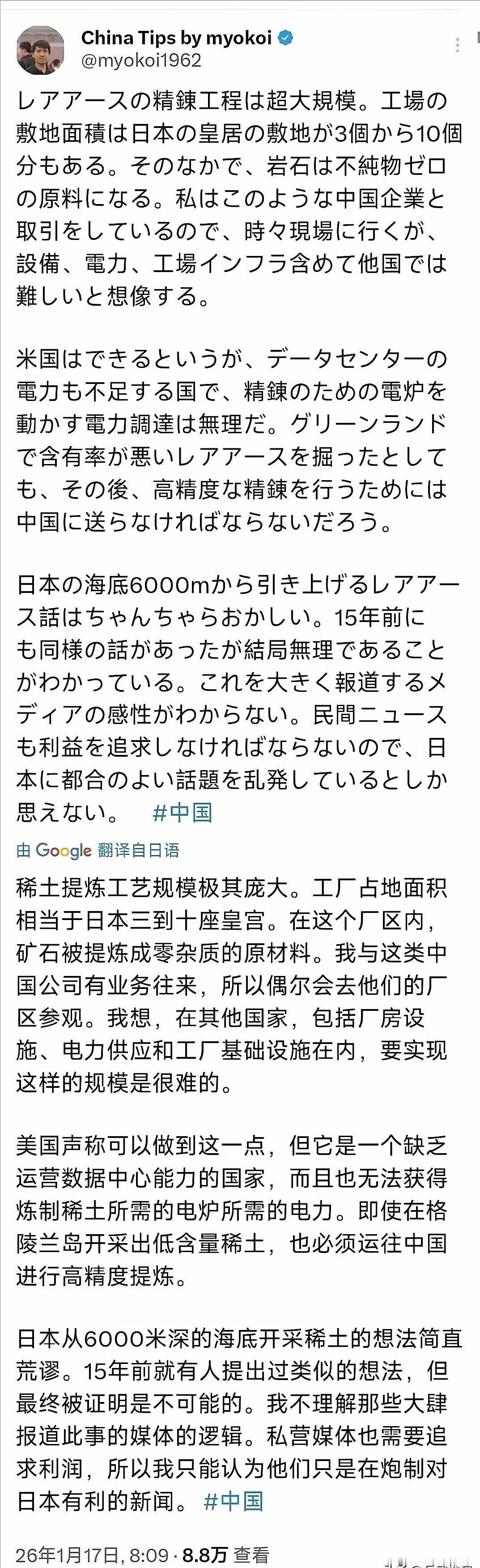 1月17日,一个亲自参观过我国稀土提炼工厂的日本人在社交平台发文,竟然毫不客气地
