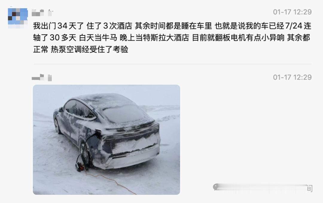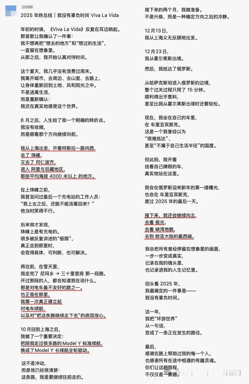 一位上海车主,开着Model Y长续航版,独自踏上了环球自驾之旅。最硬核的一段是:进入芬兰北极圈,在极寒中连续30多天吃住在车里。 “白天赶路,晚上是‘特斯拉大酒店’。”车辆几乎24小时不间断运转,白天当牛马赶路,晚上化身卧室。在如此高强度、极低温的考验下,车辆状态稳定,热泵空调系统也经受住了考验。 车主说,选择特斯拉,是因为此前它已陪自己穿越西藏,征服过珠峰和冈仁波齐的险峻,用真实旅程建立了信任。“我想给特斯拉正名,给车主争口气。” 这不是一次商业之旅,而是一次纯粹的产品极限验证。当一辆车能陪你从上海到北极,从高原到极寒,这本身,就是最硬核的广告。【来自懂车帝车友圈】