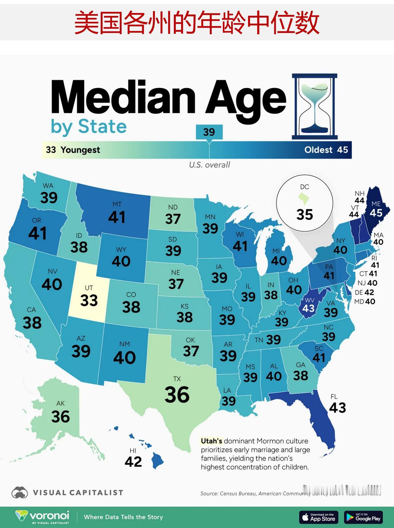 全美的年龄中位数为 39.2 岁,各州的年龄中位数怎样? 在美国,不同地区的年龄分布情况差异很大。下面地图利用最新的美国全国性统计数据来凸显这些差异。 此图数据来源于美国人口普查局的 2024 年 1 年度美国社区调查(ACS)。该报告列出了各州以及哥伦比亚特区的年龄中位数。 ——年龄最大的州大多集中在东北部 截至 2024 年,全美的年龄中位数为 39.2 岁。 新英格兰地区及周边各州在排名中占据前列。缅因州以 45 岁的年龄中位数位居全美之首,其次是佛蒙特州和新罕布什尔州,均为 44 岁。其他几个东北部州,包括宾夕法尼亚州、康涅狄格州和罗得岛州,其年龄中位数也超过了 41 岁。 这些较为年长的人口结构反映了长期存在的趋势,比如人口增长放缓、出生率降低以及年轻劳动力的流入减少。 ——“阳光地带”呈现出复杂的人口结构图景 许多“阳光地带”的州与全美年龄中位数水平较为接近,但也存在一些例外情况。 佛罗里达州的年龄中位数为 43 岁,这一特点主要由于其庞大的退休人员群体。相比之下,得克萨斯州的年龄中位数为 36 岁,这反映出该州人口增长较快以及劳动力较为年轻。 与此同时,像亚利桑那州、内华达州和北卡罗来纳州这样的州的年龄中位数接近 39岁。 ——年轻人口在西部和平原地区占主导地位 最年轻的州大多位于西部和大平原地区。 犹他州显然是个异类,其年龄中位数为 33岁,这得益于较高的生育率以及家庭规模较大等因素。哥伦比亚特区的居民年龄也普遍偏年轻,这在一定程度上是由于该地区集中了大量处于工作年龄的成年人所致。