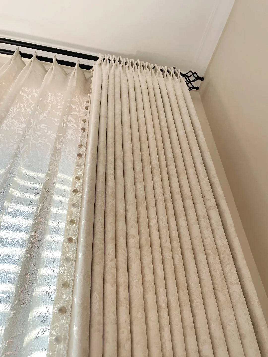 温柔的奶茶色真的百搭各种风格,雪尼尔的材质软乎乎的特别细腻,摸起来也质感满满,肌理感的暗纹提花让窗帘自带层次感,侧边的复古丝绒球球花边,精致又温馨~