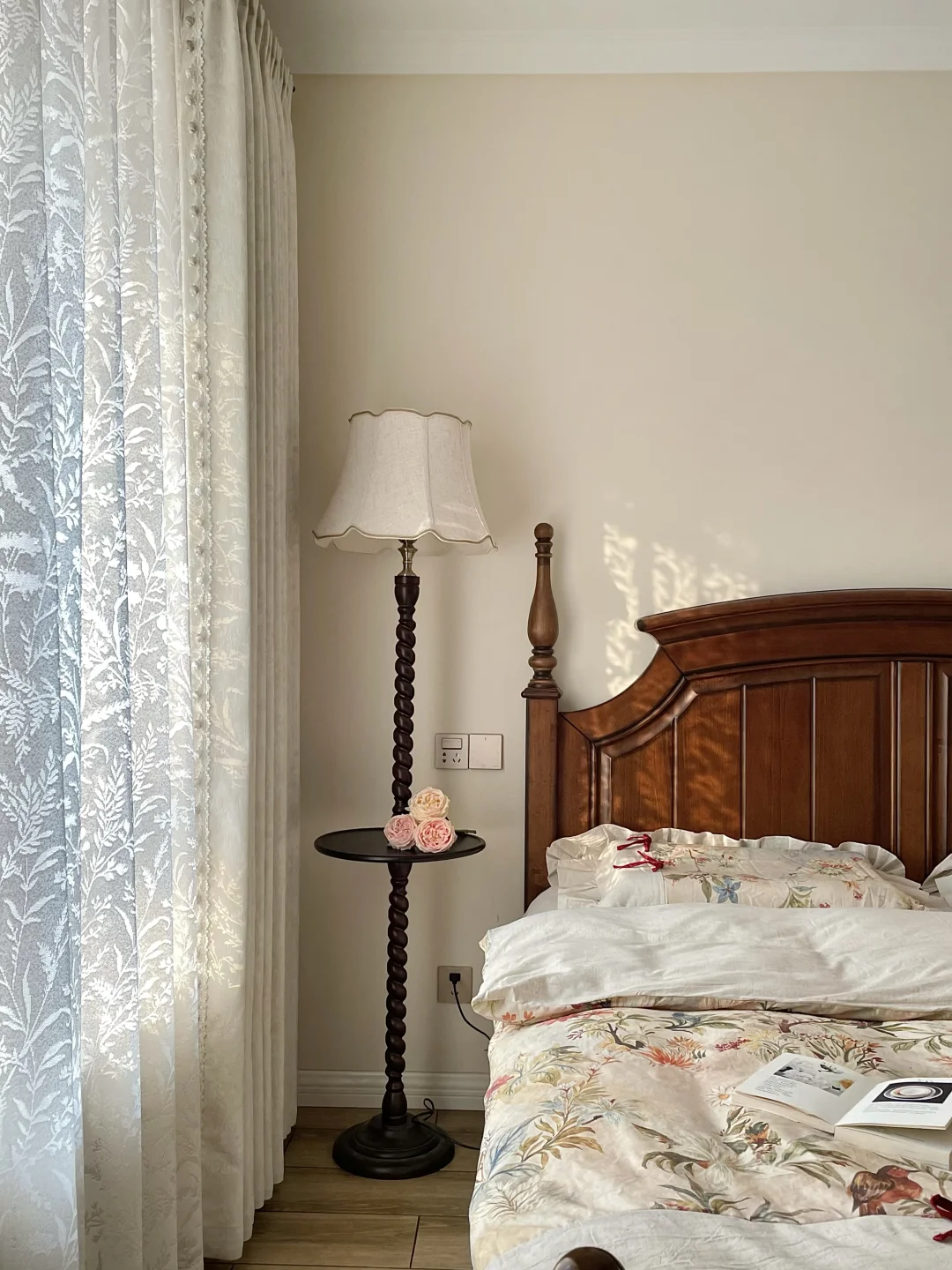 晴天的卧室真的美😍阳光透过镂空的枝叶图案,在墙面和地板上投下斑驳光影,像把春天搬进了房间,连空气都变得温暖起来🌿