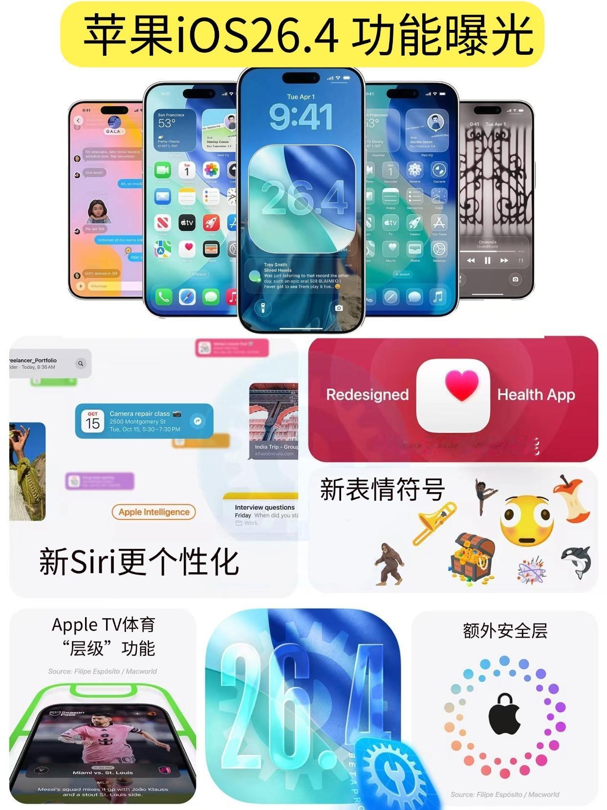 iOS26.4:惊喜不大惊吓没有 最近看到iOS26.4的爆料,感觉苹果这次挺务实的。Siri要接入Gemini了,说实话现在Siri的理解能力真的一般,问个稍微复杂一点的事情就答非所问,希望这次能靠谱一点 新emoji倒是挺有意思,大脚吗喽和惊讶脸已经想好给朋友改什么备注了。这个AirPods的室外定位精度挺升,对于我这种丢三落四的人来说算是救星。 整体来看,没有什么特别眼前一亮的功能,但都是实际问题的小改进,日常用起来应该会舒服不少。