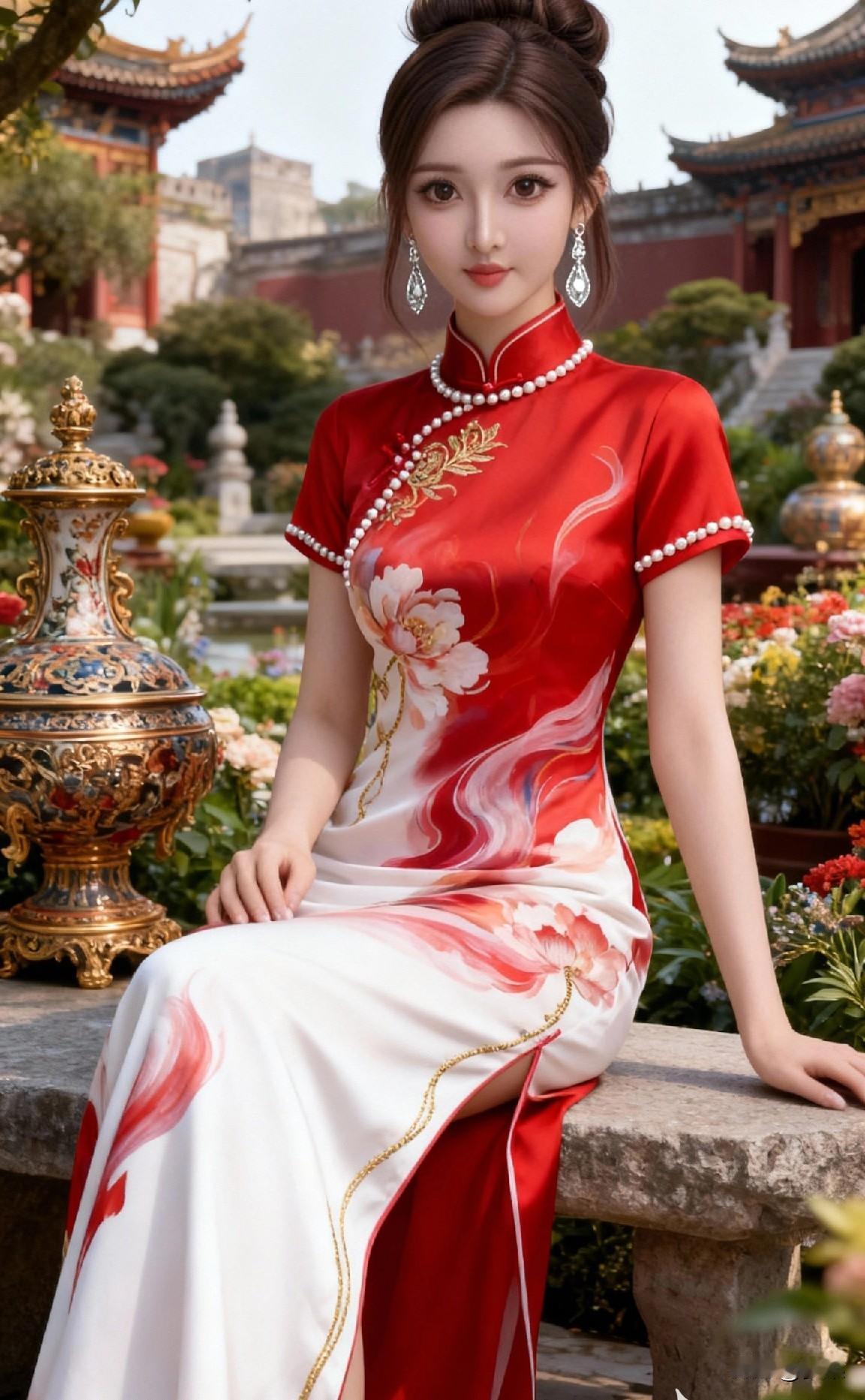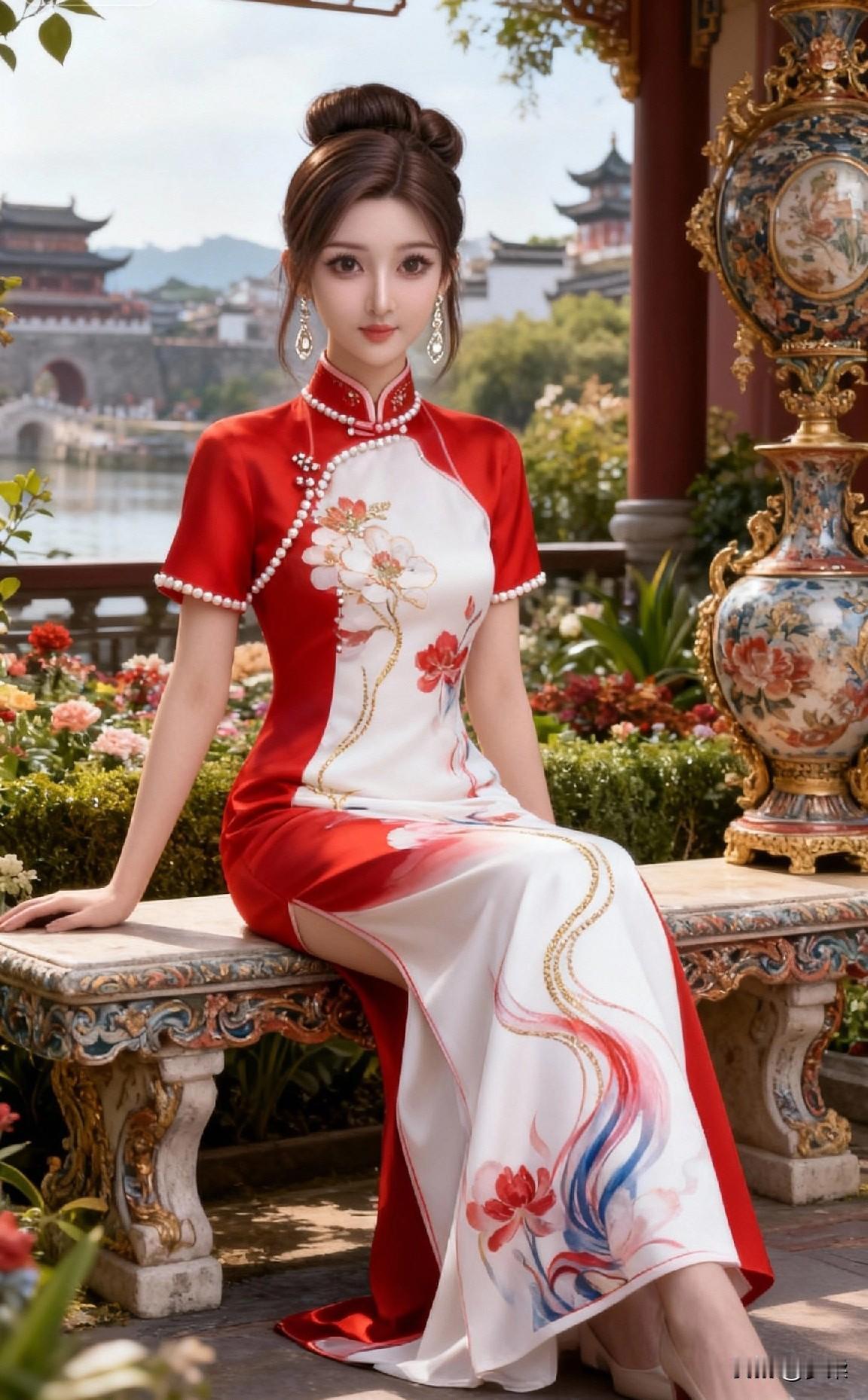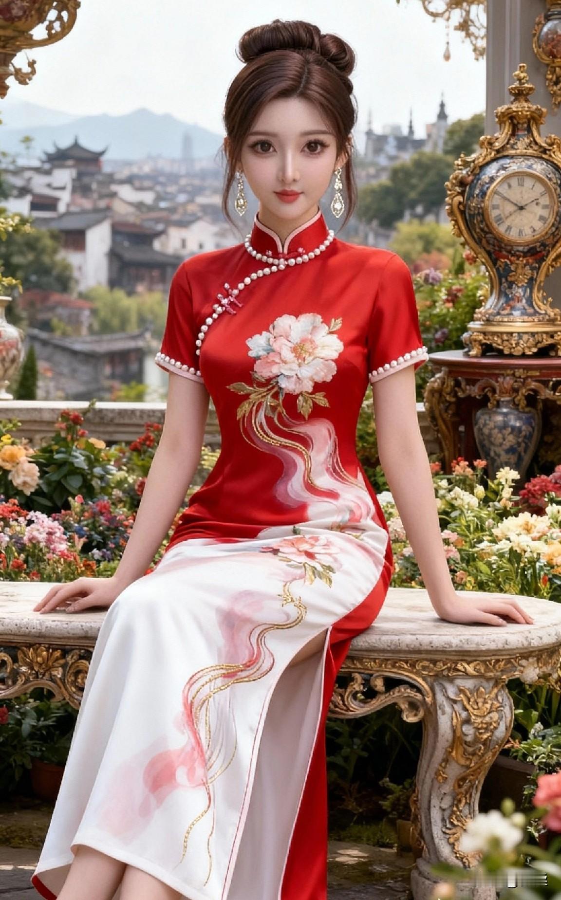 穿越时空的古典美人,红白相间的旗袍,韵味十足!