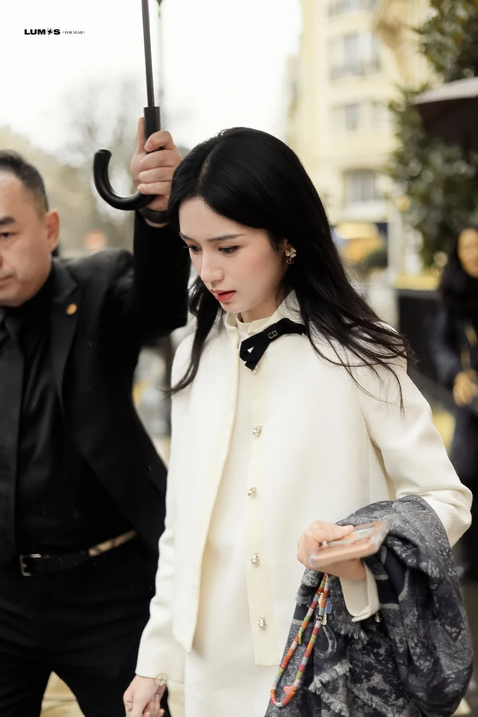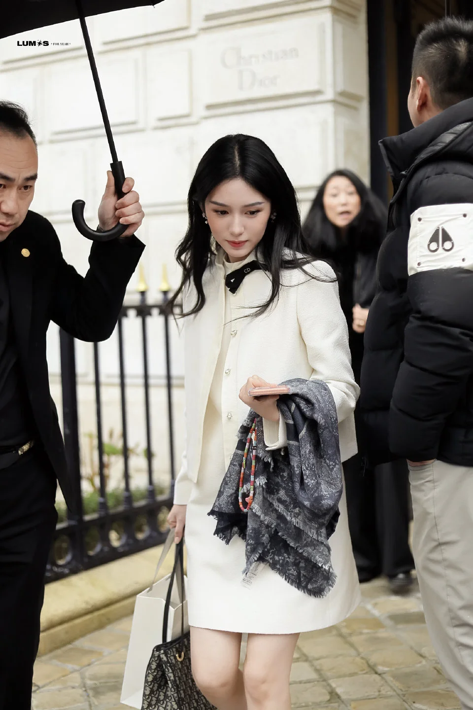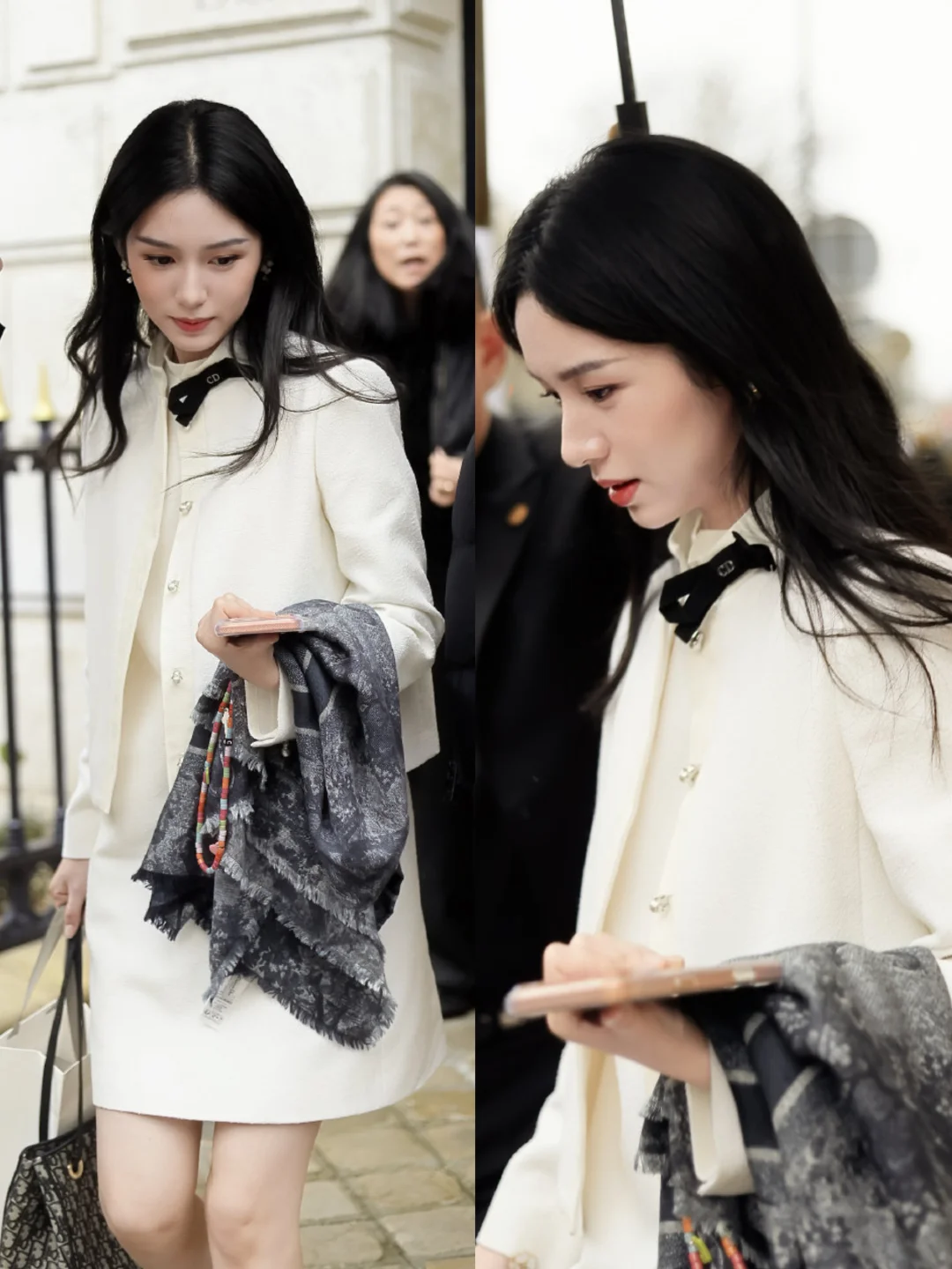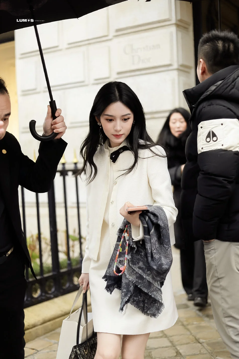 周也巴黎出街look,简洁的纯白外套配连衣裙,白富美穿搭太适合她! 图片来源 Lumos_周也