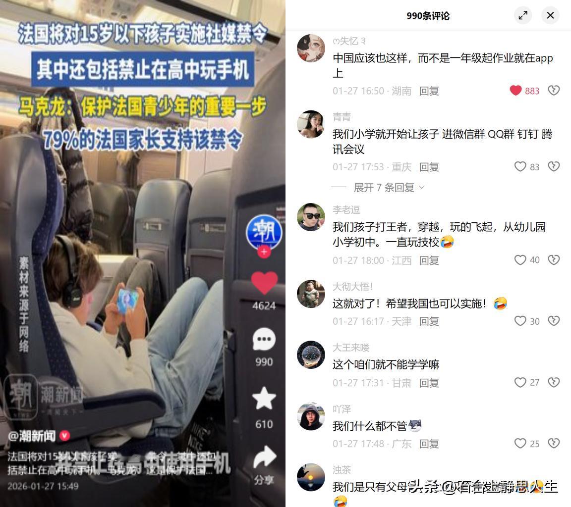 法国禁15岁以下用社媒 看着79%法国家长举双手赞成的新闻,国内家长群里一片羡慕哭了。咱们早就有手机管控的相关规定,可为啥大家总觉得没管住? 政策倒是有了,难在落地。学校执行差得远,有的一刀切不让带手机,家长怕孩子遇事儿联系不上;有的管得松,孩子偷带手机躲在宿舍玩到深夜。家里更难,作业要在APP上提交、视频打卡,家长自己上班都离不开手机,根本没法给孩子做榜样。孩子们反倒比大人懂钻空子,借别人账号玩游戏、用旧手机藏着刷视频,防不胜防。 与其说家长羡慕禁令本身,不如说是羡慕不用自己单打独斗的踏实。不用一边催孩子赶APP作业,一边又要抢他手里的游戏手机;不用跟平台投诉完沉迷机制,转头又得用同款APP开家长会。 比起盼着一刀切,或许更该问,怎么让政策真落地,让家长不再孤军奋战?