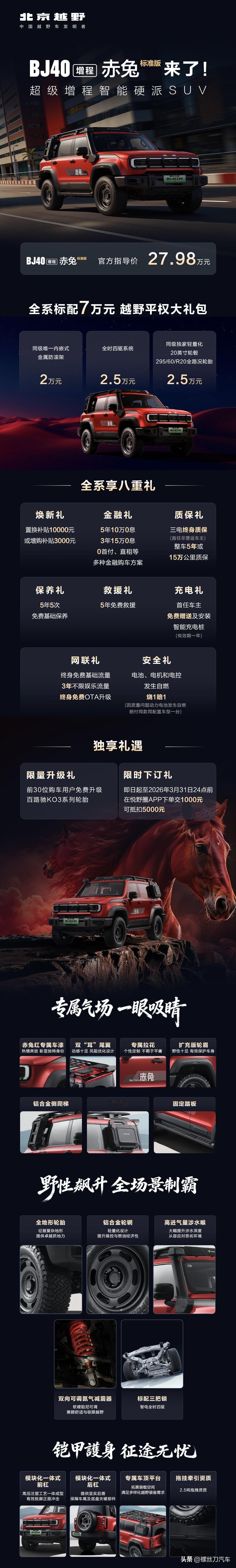 北京越野BJ40增程赤兔标准版正式上市:售价27.98万元! 作为了解,BJ40增程赤兔版提供原厂改装套件,大幅提升户外越野性能;新款BJ40则主要针对配置升级,例如全系标配15.6英寸中控屏/副驾娱乐屏和2.5T拖拽资质等等;BJ40增程悦野飞行版则会提供车载无人机。 作为越野圈的老牌选手,BJ40凭借非承载式车身、分时四驱与亲民价格,各系列版本也都能满足不同使用场景,成为兼顾越野与家用的务实之选。
