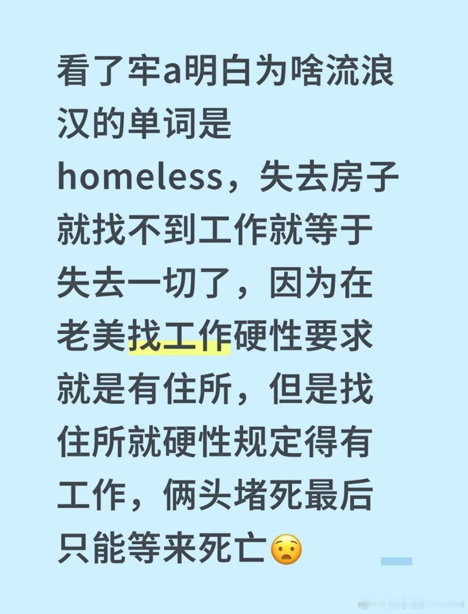 美国流浪汉睡在雪地里看了牢a明白为啥流浪汉的单词是homeless,失去房子就找不到工作就等于失去一切了,因为在老美找工作有要求就是要有住所,但是找住所就要求得有工作,最后就被两头堵了,只能流落街头。