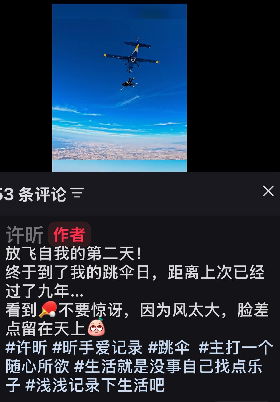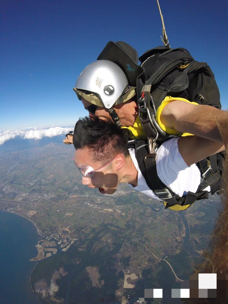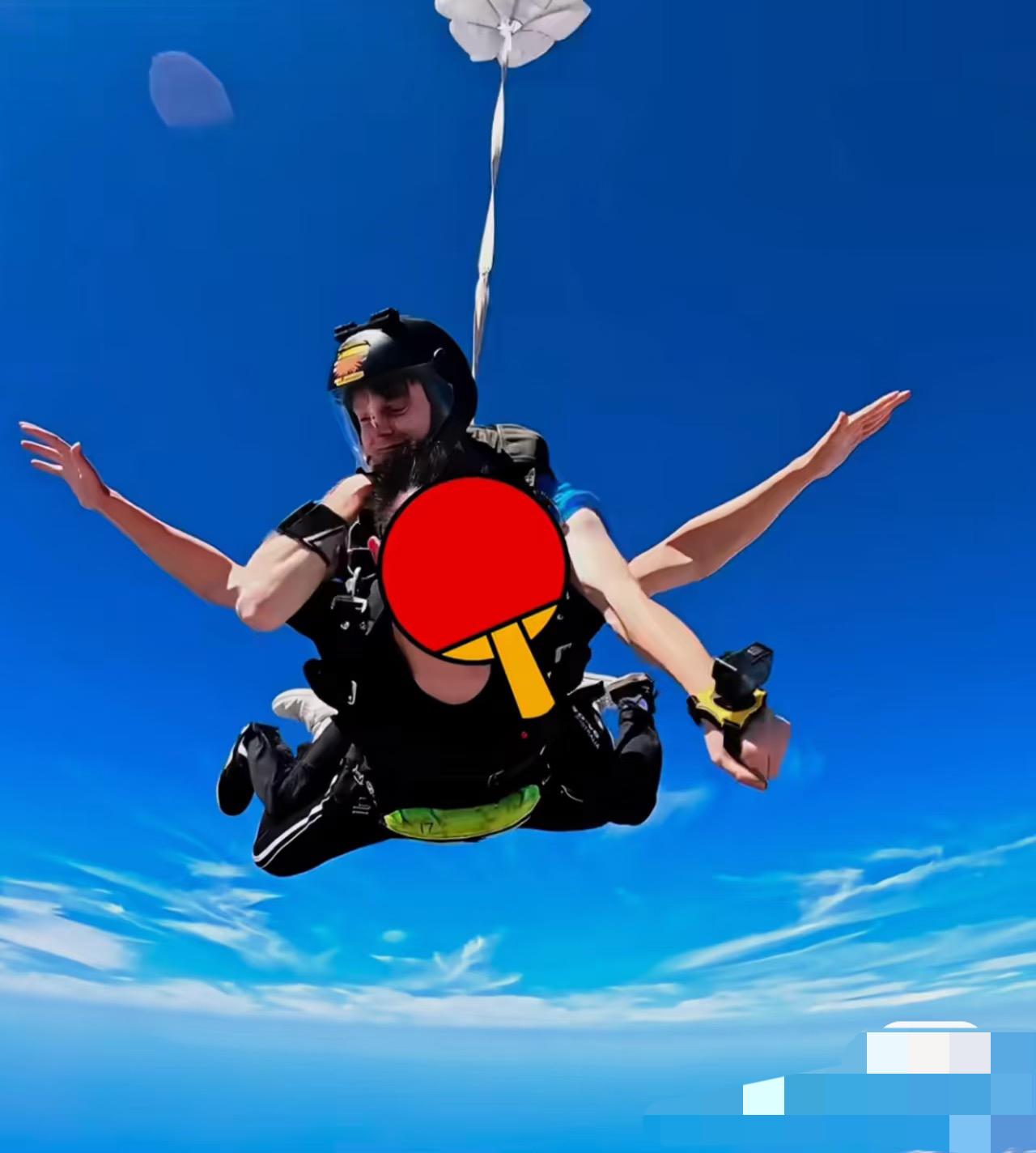 许昕更新:放飞自我的第二天,终于到了我的跳伞🪂日! 距离上次跳伞已经过去了九年, 看了🏓不要惊讶, 因为风太大, 脸上差一点留在天上! 许昕已经有了偶像包袱, 竟然给自己的脸打了码, 而且还打了两次码, 我还以为跳伞🪂是趴在别人背上, 当地气温46摄氏度, 这么热的天气, 居然去跳伞🪂, 视频全程都好帅, 太厉害啦, 太棒啦太勇敢啦! 果然和老婆出去玩, 一下子都变年轻啦, 玩跳伞运动的朋友都非常勇敢, 身体素质过硬, 许昕放松方式很好👍, 玩的开心! 功成名就,儿女双全, 许昕妥妥的人生赢家啊!