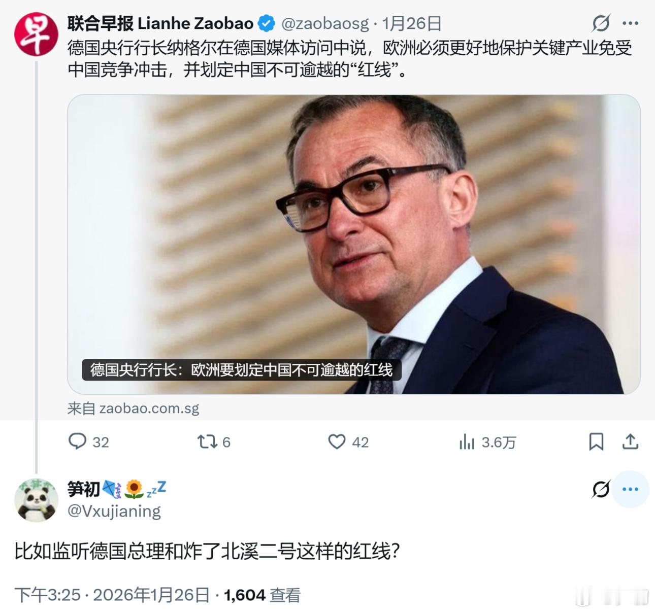 德国央行行长纳格尔在德国媒体访问中说,欧洲必须更好地保护关键产业免受中国竞争冲击,并划定中国不可逾越的“红线”。比如监听德国总理和炸了北溪二号这样的红线?
