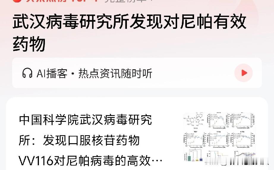 最新消息! 不用怕了,武汉病毒研究所有特效药能对付尼帕!所以说,可以预见这个病毒很快就会消失,也不用去研究研制了,直接能给他对症下药。现在对付病毒有经验了,只要一出来新病毒, 人工智能马上就能研究出药物来,你想想新冠肺炎的时候,那个时候哪里有什么人工智能啊?