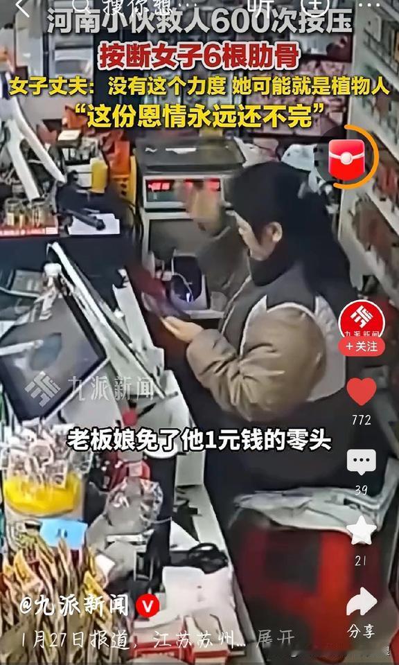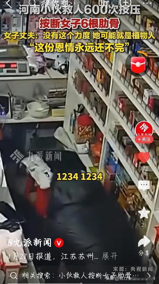 河南小伙在苏州超市,为救突然晕倒的老板娘,胸外按压按断她6根肋骨,这事儿太戳心了!小伙没学过急救,却在120指导下硬撑20多分钟按了600次,哪怕犹豫过人工呼吸,也没停下救人的手。事后他怕被讹,还好老板娘家属拎得清,直说救命之恩一辈子还不完,肋骨骨折根本不算事。 法律早给见义勇为撑腰,紧急救助免责!这世上从不是好人难做,而是善良遇善良,温暖抵温暖。小伙的勇,家属的懂,才是最该传的正能量,愿每个伸手的好心人,都能被温柔以待! 小伙救人按断女子6根肋骨收到谢谢 小伙救人按断6根肋骨获感谢 见义勇为从不是小事 人间温暖双向奔赴 河南救人 心肺复苏救 江苏救人 救人按胸