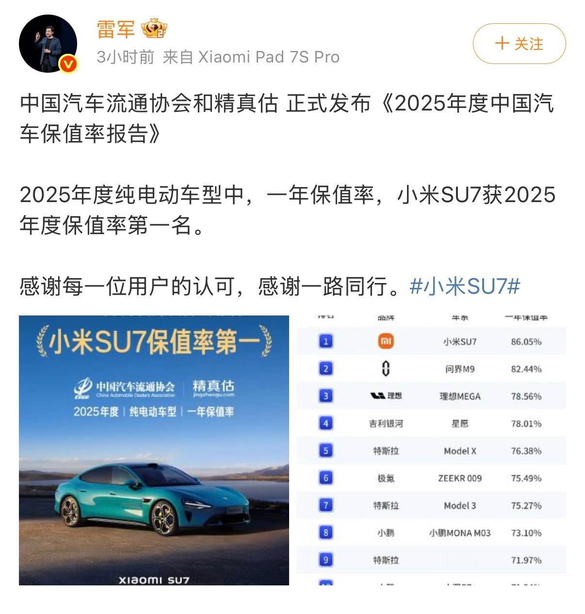 数据最直观了,小米SU7拿下2025年纯电保值率第一,高达86%。远超24年冠军Model X的81%、23年冠军Taycan的80%,创近三年纯电最高纪录,首次上榜即登顶。这成绩也让小米SU7在高端豪华车中有了领先优势,以80%以上保值率更是跻身Model X、宝马X5等同级市场认可梯队。小米SU7保值率纯电车全年第一毫无疑问,高保值源于硬实力,SU7销量超39万成销冠,二手车周转仅10天远超行业均值,39万车主认可印证大众喜爱。作为安全、操控、智能化无短板的六边形战士,它打破电动车保值率不如油车的认知,销量与保值率双超特斯拉Model 3,终结其神话。只能说老款已封神,新一代SU7更值得期待呀~