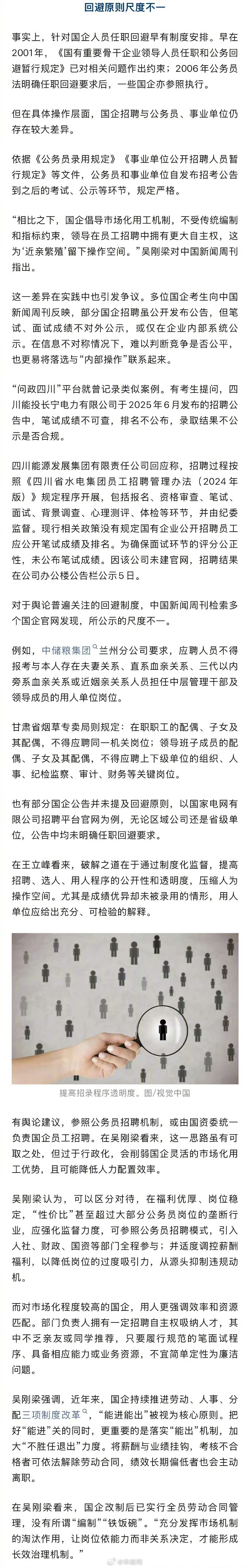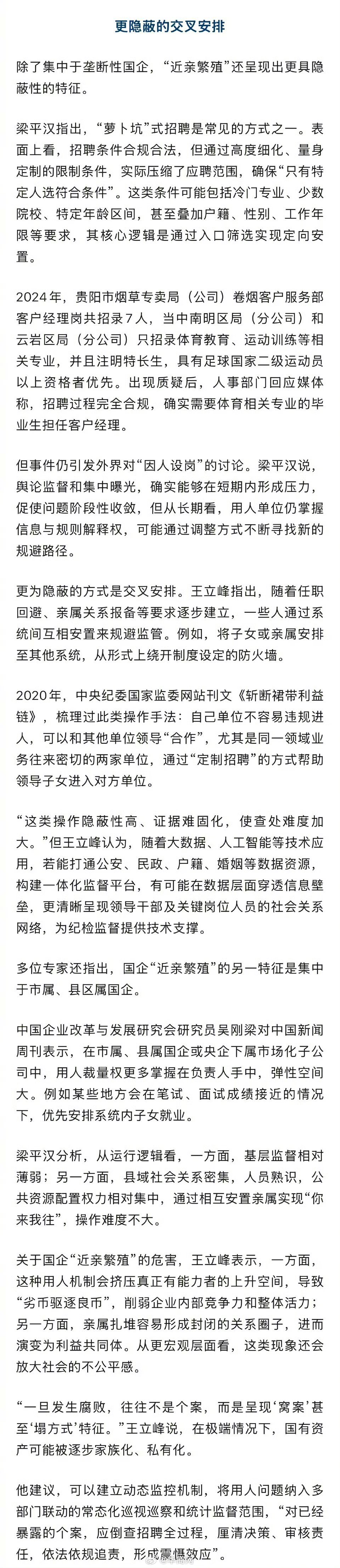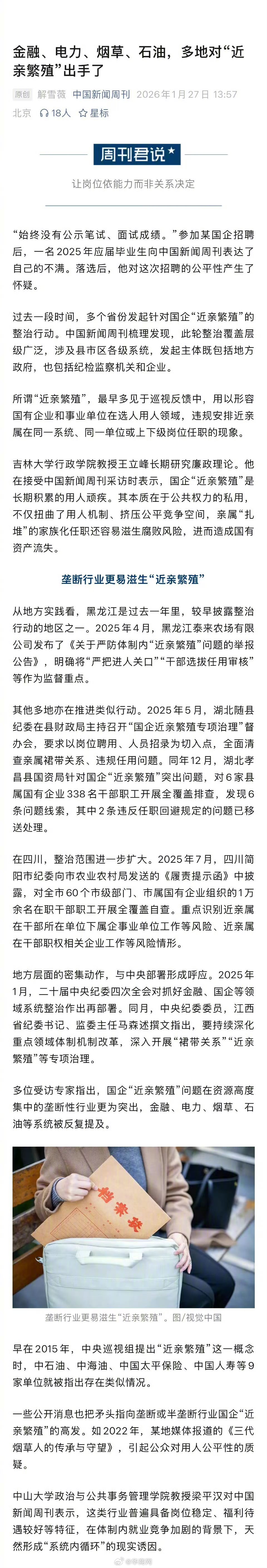 【#多地对国企近亲繁殖出手了#】#金融电力烟草石油系统近亲繁殖突出# “始终没有公示笔试、面试成绩。”参加某国企招聘后,一名2025年应届毕业生向表达了自己的不满。落选后,他对这次招聘的公平性产生了怀疑。过去一段时间,多个省份发起针对国企“近亲繁殖”的整治行动。梳理发现,此轮整治覆盖层级广泛,涉及县市区各级系统,发起主体既包括地方政府,也包括纪检监察机关和企业。所谓“近亲繁殖”,最早多见于巡视反馈中,用以形容国有企业和事业单位在选人用人领域,违规安排近亲属在同一系统、同一单位或上下级岗位任职的现象。吉林大学行政学院教授王立峰长期研究廉政理论。他在接受采访时表示,国企“近亲繁殖”是长期积累的用人顽疾。其本质在于公共权力的私用,不仅扭曲了用人机制、挤压公平竞争空间,亲属“扎堆”的家族化任职还容易滋生腐败风险,进而造成国有资产流失。多位受访专家指出,国企“近亲繁殖”问题在资源高度集中的垄断性行业更为突出,金融、电力、烟草、石油等系统被反复提及。早在2015年,中央巡视组提出“近亲繁殖”这一概念时,中石油、中海油、中国太平保险、中国人寿等9家单位就被指出存在类似情况。一些公开消息也把矛头指向垄断或半垄断行业国企“近亲繁殖”的高发。如2022年,某地媒体报道的《三代烟草人的传承与守望》,引起公众对用人公平性的质疑。中山大学政治与公共事务管理学院教授梁平汉对表示,这类行业普遍具备岗位稳定、福利待遇较好等特征,在体制内就业竞争加剧的背景下,天然形成“系统内循环”的现实诱因。