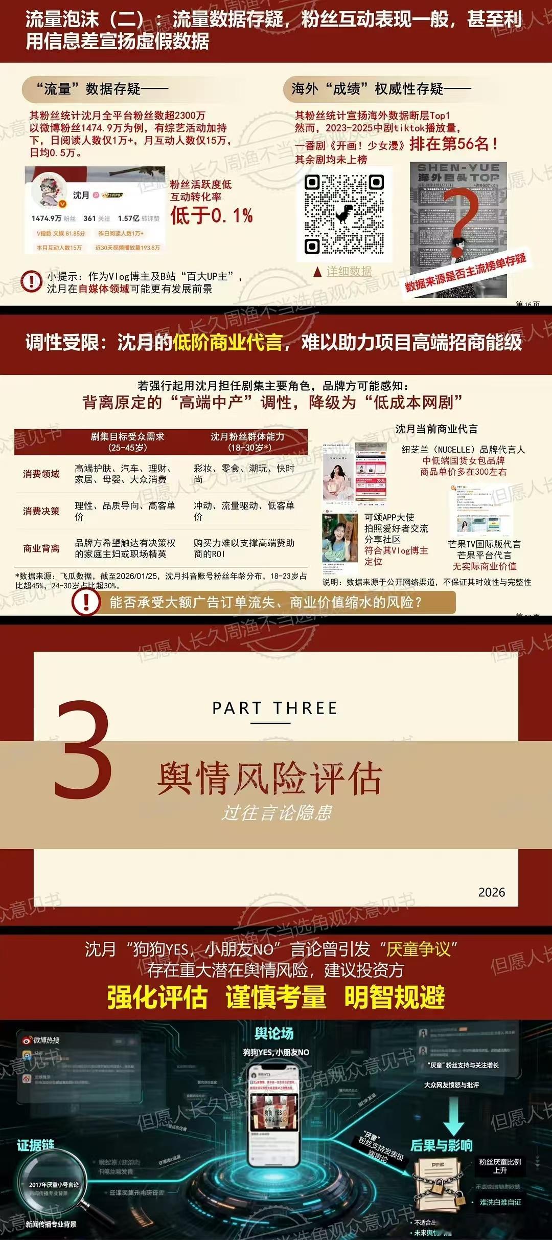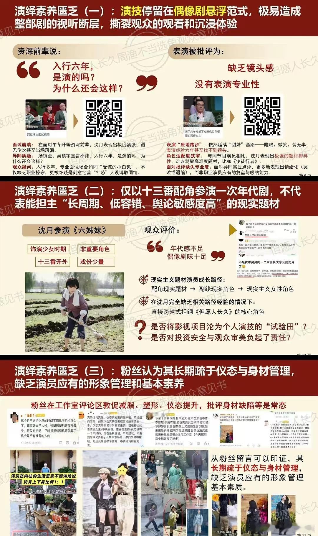 张晚意粉丝专门制作了一个 ppt,为了抵制沈月出演《但愿人长久》这两家怎么闹成这个样子了?最主要的是这些料都能查找到…这里面说沈月日系少女风格不适合家庭群像剧,还说沈月身材管理不行,演技也一直都没什么太大的进步。还有猛犬袭击幼童事件发酵期间,她发了一张狗狗yes小朋友no的图片,被网友打上了厌童标签🥲现在流行粉丝出来图文并茂的抵/制了吗🤔
