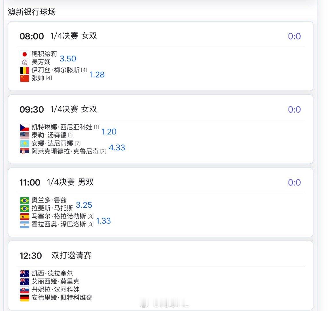 澳网2026 明日赛程8:00 张帅/梅尔滕斯 vs 穗积绘莉/吴芳娴 张帅冲击四强,预测下这场比分是__?网球talking大会