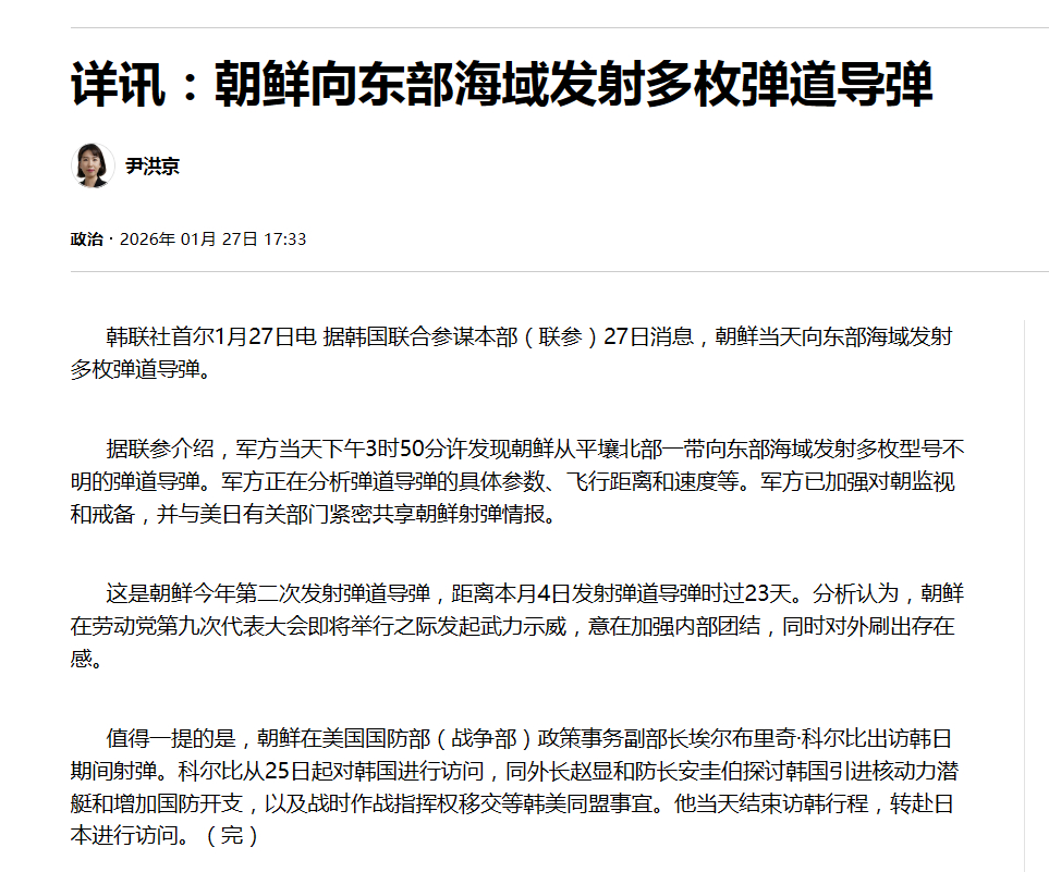主体人似乎又打了两发高超,韩国人先是通报是飞行物,后面确认是弹道导弹。