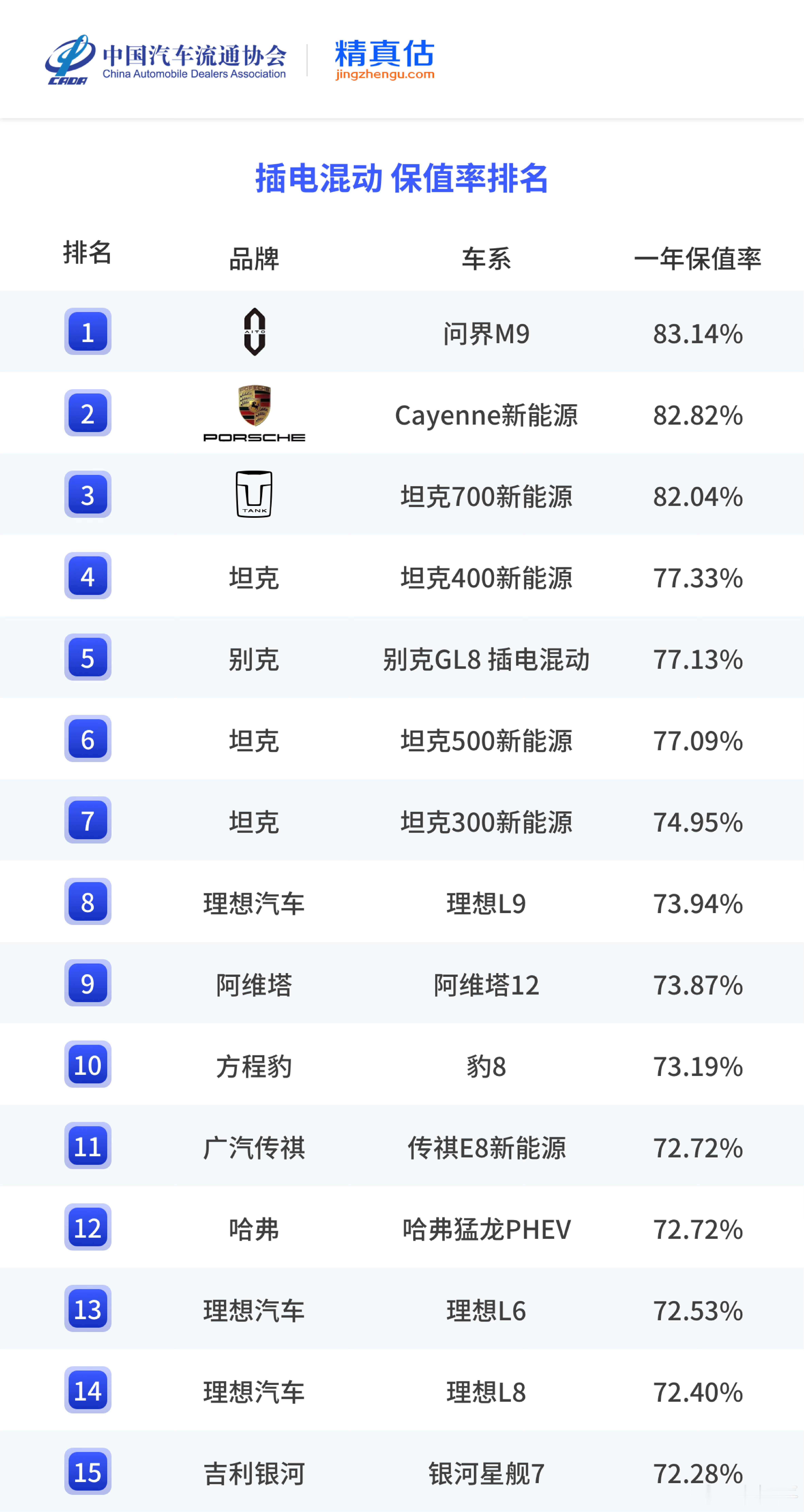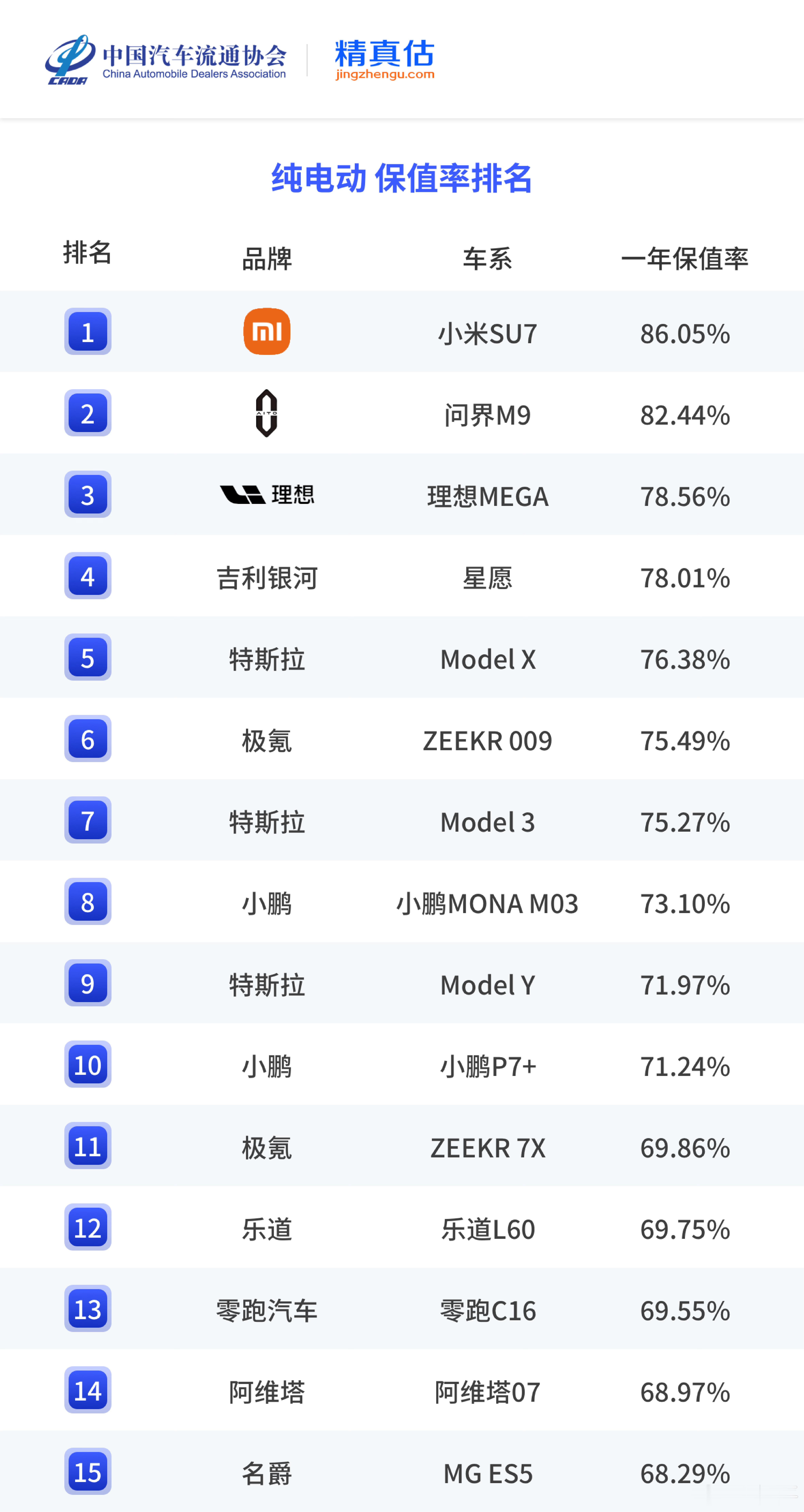 雷军回应小米SU7保值率第一名2025年度保值率榜,数据出自中国汽车流通协会和精真估。直接放大家最关注的新能源类目吧。纯电前三强为小米SU7、问界M9、理想MEGA;插混/增程前三强是问界M9、卡宴新能源、坦克700;新能源汽车大v聊车