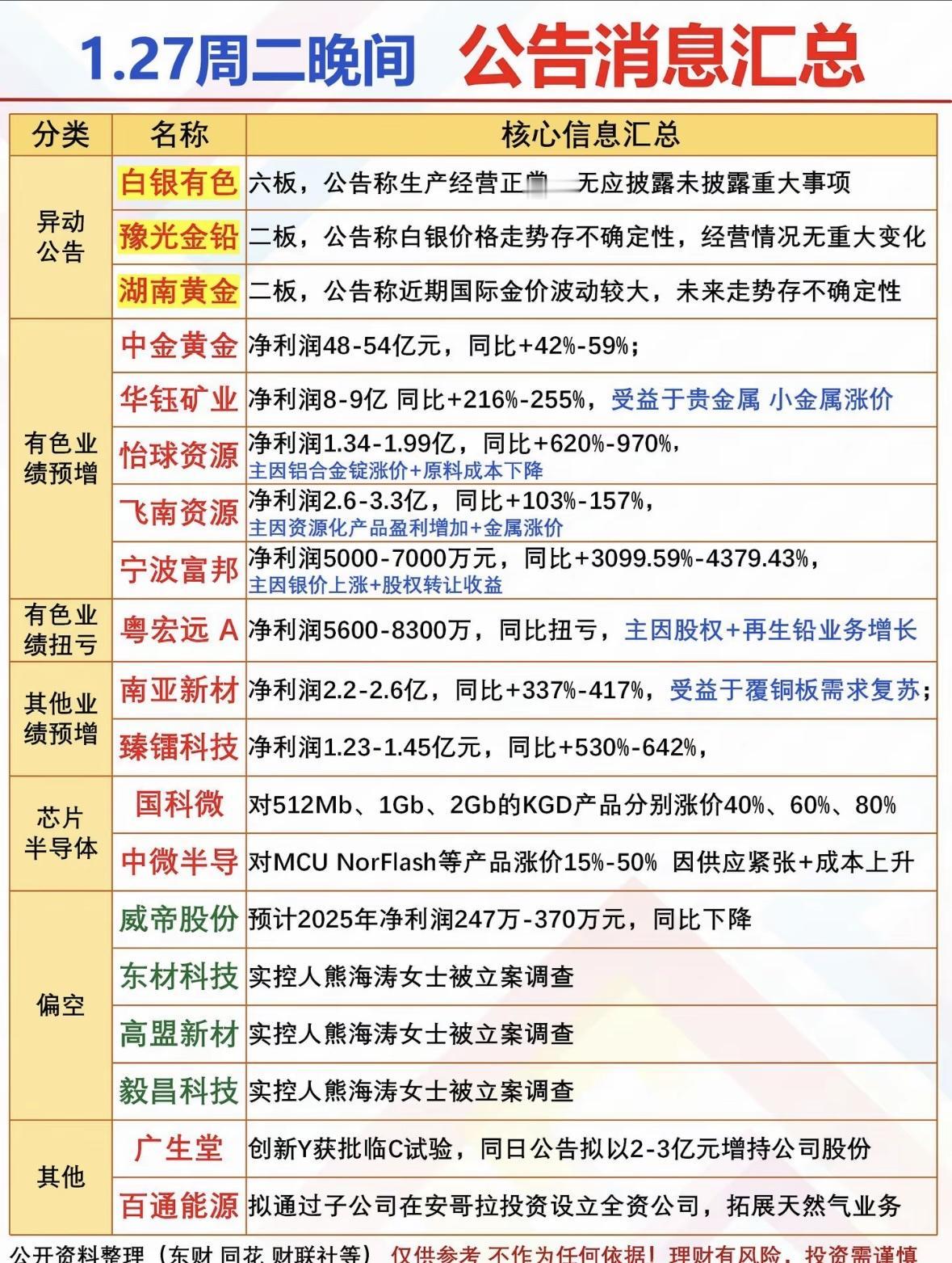 📢 1.27周二晚间公告汇总,行业动态一览无余! 贵金属企业业绩大增,芯片涨价潮来袭,多家公司实控人被查,投资需谨慎。 贵金属与有色板块业绩亮眼,芯片半导体涨价,多家公司净利大增,投资需谨慎。