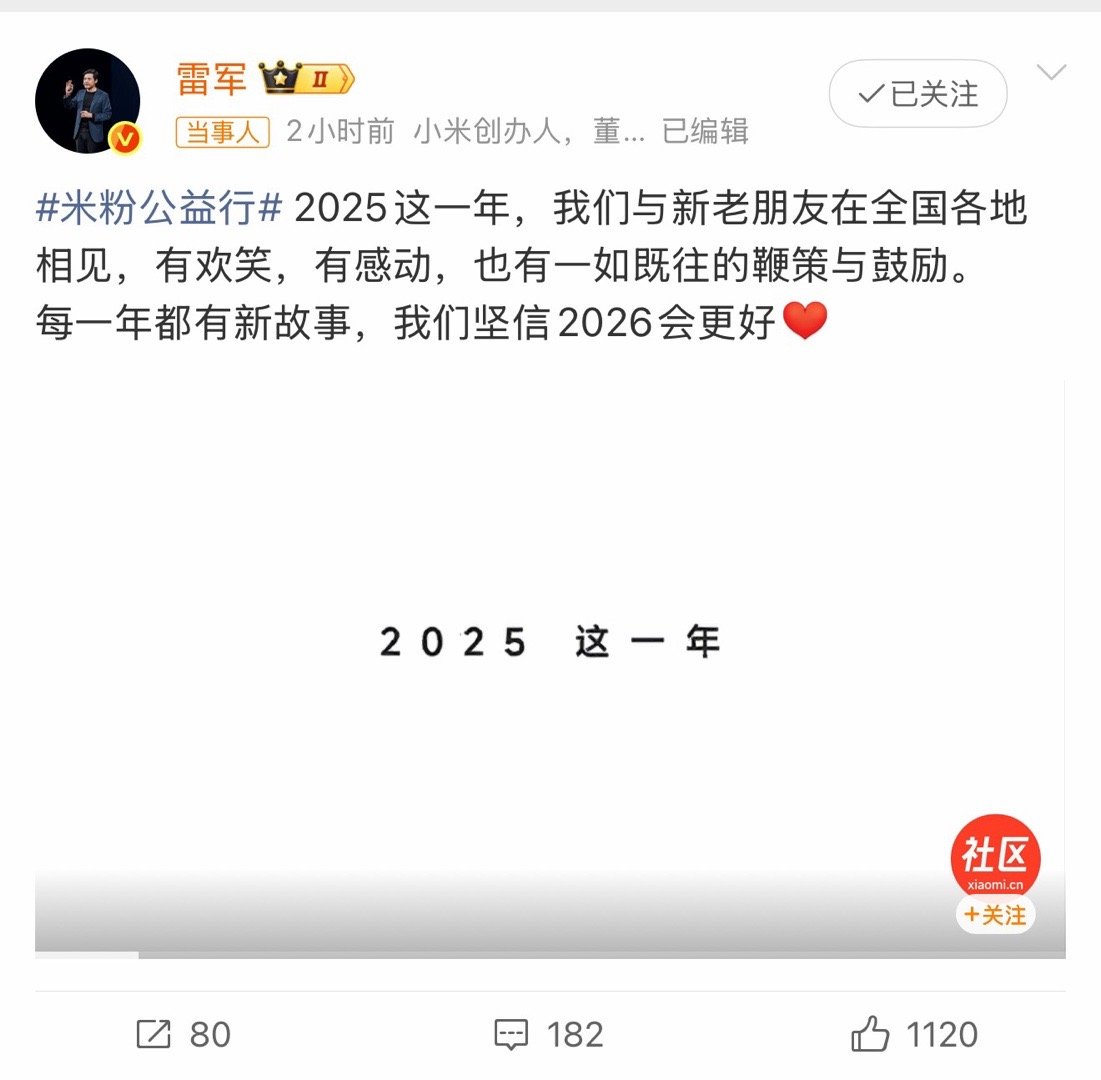 小米是真把米粉当自家人,而且不是光说不做的那种,米粉节不仅有超值优惠加码、全品类福利放送,更打造了高参与度的用户共创,提案落地、产品共创率超90%,让米粉从消费者变成品牌参与者。从影展征集到公益月行动,从线上社群互动到线下打卡联动,千万米粉与小米双向奔赴,所以小米的成长从不是孤军奋战,人车家全生态的进阶、各赛道的亮眼成绩,都离不开米粉的支持。雷军转发2025米粉活动小结这份小结,是小米对米粉的回馈,更是彼此陪伴、共赴未来的新起点~