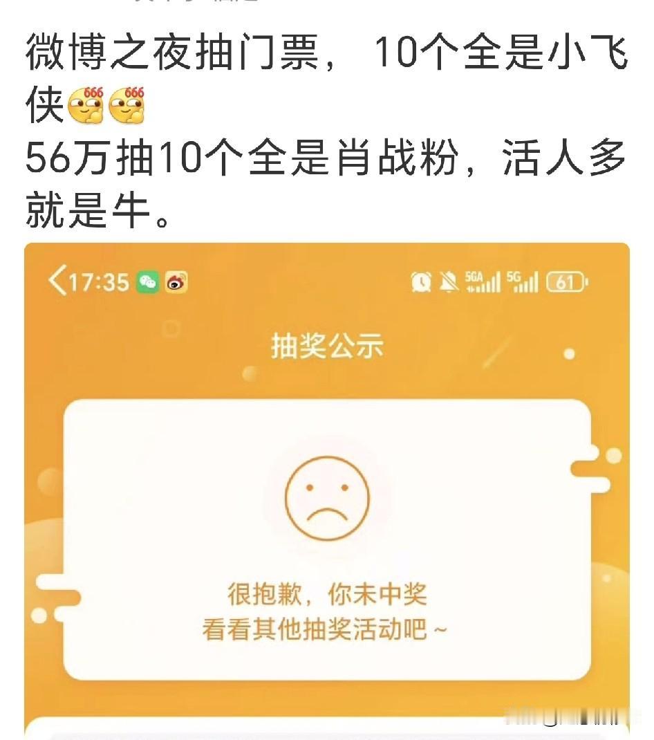 肖战粉丝活人太多了,微博抽奖,56万评论抽10个人送门票,10个全是肖战粉丝小飞侠,这种中奖比例能达到100%的,就知道这56万人里至少90%以上是肖战粉丝,这10张票赢得爽[赞]营销号都惊了