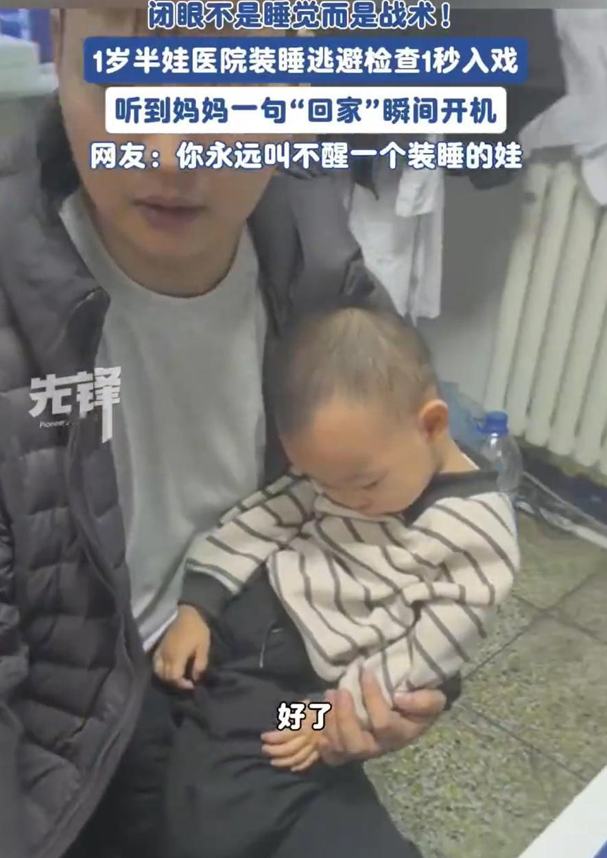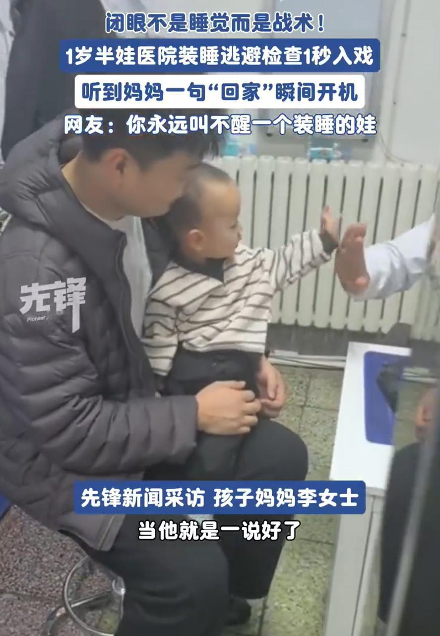 笑死了!河北廊坊,一对年轻父母带着一岁多的孩子去诊所看医生,没成想,孩子从进入诊室的那一刻起就秒变影帝,想着法的逃避医生,装睡的样子逗的爸爸哈哈大笑,网友:奥斯卡都欠他一座小金人 诊所里,这个可爱的萌娃进屋后先是冲着医生连连摆手,那意思再明显不过:再见,赶紧走。发现这招不管用,医生和爸爸妈妈都没有要离开的意思,小家伙马上换了策略,眼睛一闭,脑袋一歪,直接“睡”了过去。要不是亲眼所见,很难相信一个这么小的孩子能有如此迅速的反应 抱着他的爸爸,看着儿子这番操作,实在忍不住笑出了声。更逗的是,当妈妈说了一句“好了,咱们回家啦”,刚才还“熟睡”的孩子立马睁开眼睛,精神十足,仿佛刚才的一切从未发生 不少网友看到这一幕,也表示自家孩子也有类似的“绝招”,为了不打针不吃药,什么招都能想出来 其实,孩子害怕医生是再正常不过的反应。白大褂、消毒水气味、陌生的环境,加上可能有的不愉快记忆,比如打针的疼痛、药的苦味,都会让孩子对医院产生抵触。这个小宝宝的“装睡战术”,恰恰反映出孩子已经具备了观察环境和做出应对的初步能力 从成长角度看,一岁半左右的孩子正处于自我意识萌发阶段。他们开始懂得表达自己的好恶,会用简单的方式拒绝不喜欢的事物。面对医生时的抗拒,正是这种自我意识的表现。同时,他们也开始懂得使用“策略”,虽然这些策略在成年人看来天真可爱,但却是孩子思维能力发展的体现 细想想也是,谁小时候没怕过医生,只不过长大后学会了忍着,下次再遇到这种情况,家长多点耐心,医生多点引导,孩子慢慢就会知道,这里并不是一个需要假装睡着才能躲过去的地方