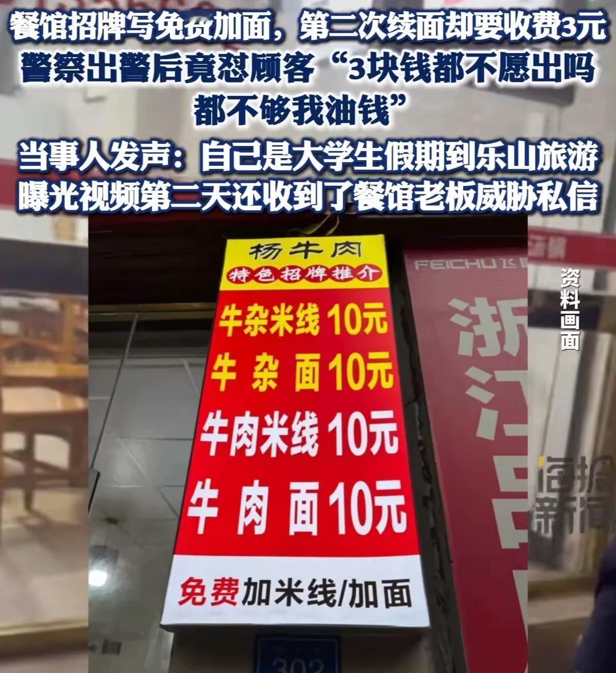 这次乐山面馆续面的事闹的沸沸扬扬,后续还被爆老板出想给吃面的邢先生500块让他删视频,结果被拒绝了。现在面馆生意差很多,老板账号都私密了,两边都说自己没错,得等官方结果。 你可以写清楚免费续面一次!你没写具体次数。正常人不续都够吃了,少数人续一次足够了,但可能有极个别人确实续一次没吃饱,人家再续也没啥问题吧?我就见过吃三大碗面条的人!只要人家没浪费!老板玩不起就不要搞免费续面的噱头! 昨天从超市买了两块钱面条我和孩子两个人愣没吃完!