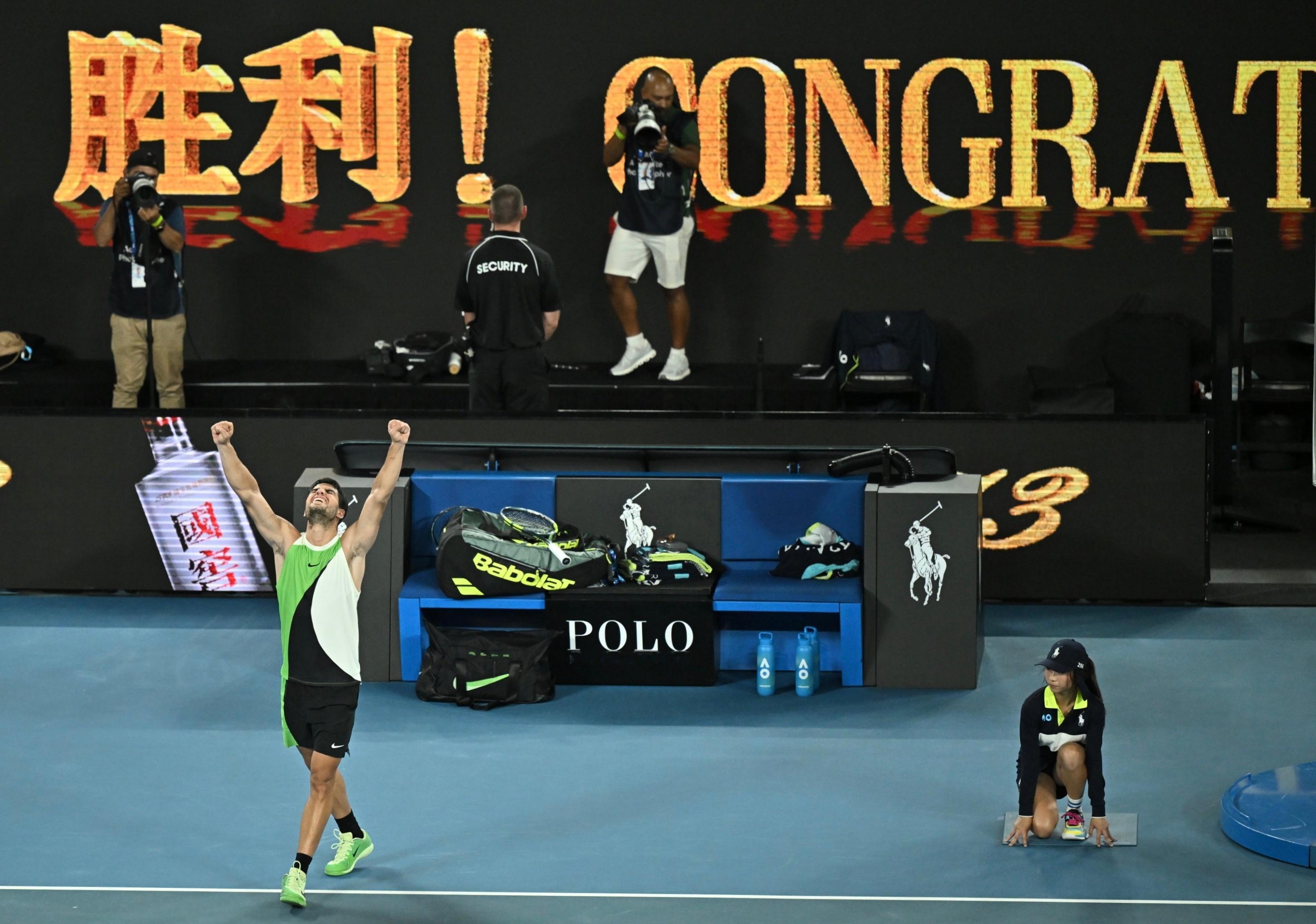 澳网男单1/4决赛,阿尔卡拉斯7-5/6-2/6-1击败德米纳尔!✅职业生涯第一次打进澳网四强✅实现四大满贯全四强✌️距离全满贯还差2胜阿尔卡拉斯首进澳网男单四强 阿尔卡拉斯大满贯全四强babolatfamily