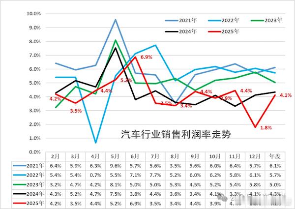 崔东树:2025年汽车行业收入111796亿元1月27日,崔东树发布了2025年汽车行业利润率的分析文章。崔东树指出,2025年1-12月汽车生产3478万台,同比增10%。2025年1-12月的汽车行业收入111796亿元,同比增7.1%;成本98498亿元,增8.1%;利润4610亿元,同比增0.6%;汽车行业利润率4.1%,相对于下游工业企业利润率5.9%的平均水平,汽车行业仍偏低。汽场全开2025年汽车行业利润4610亿元汽车行业利润率仅4.1%
