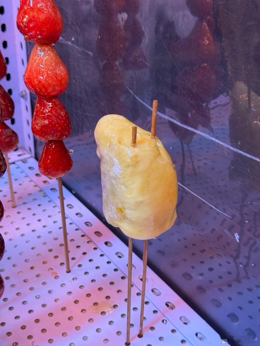 看到个榴莲冰糖葫芦,等我回来想买的时候已经卖掉了
