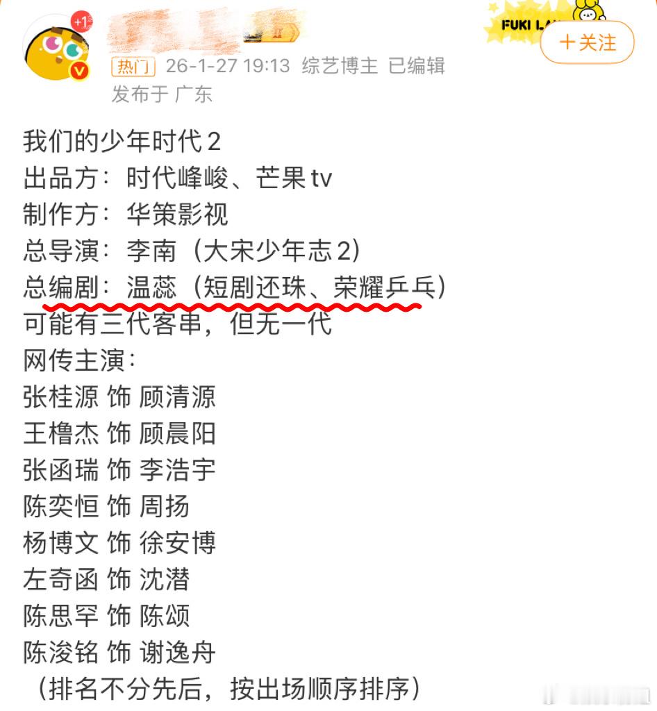 我们的少年时代2编剧🍉《我们的少年时代2》编剧:温蕊(短剧还珠、荣耀乒乓) ;网传角色也定下来了:张桂源出演顾清源,王橹杰顾晨阳适配度超高🔥00后新生代热点捕捉计划