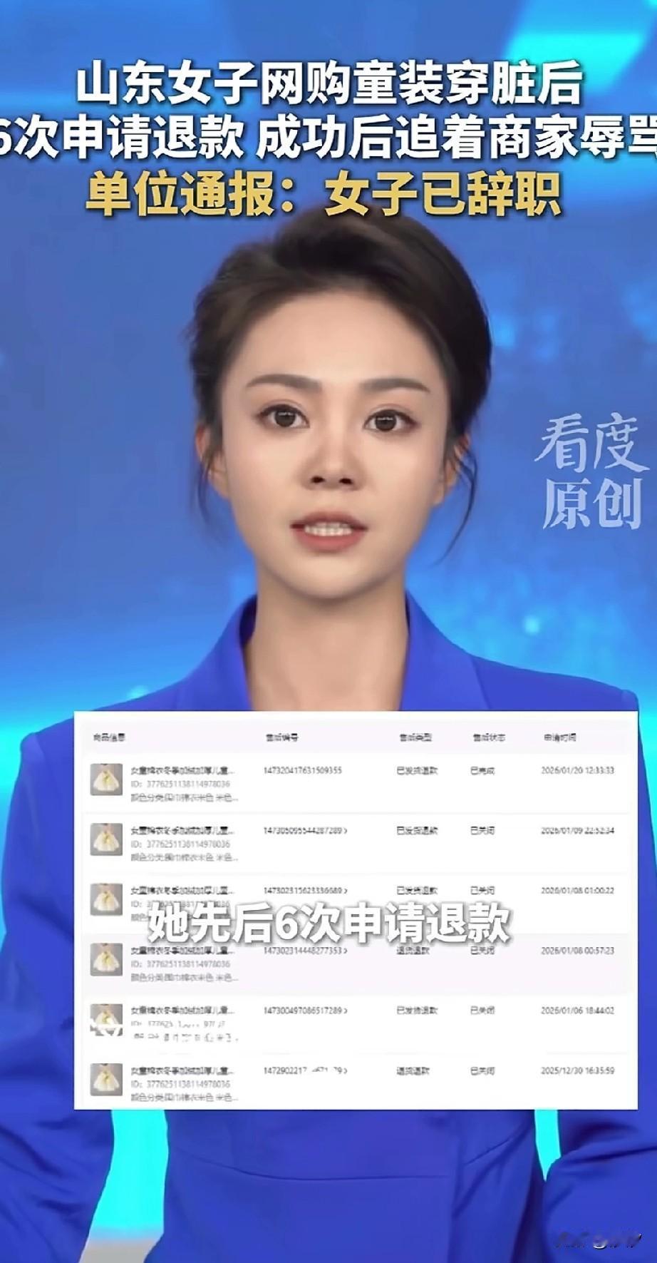 山东因退货骂人女记者后续来了, 她不仅公开道歉,还被单位开除了!山东记者直接在全国出名,因为她网购了童装之后,穿脏了就直接无理由退货! 商家拒绝之后,她直接在线对商家进行无情的辱骂,还让骂对方的孩子,言语非常恶毒! 于是商家将这事曝上了网络,却没想这位想退货的妈妈居然是位记者,而且还是在正规单位上班的,她也是一位准妈妈! 如今要生二胎了,大家更生气了,因为想不到一个正规的记者竟然这么恶毒,还是一位准妈妈,去骂商家的孩子! 真的是恶毒至极,事件发酵之后,山东记者迫于舆论压力,公开道歉,随后就被单位直接开除了! 童装穿脏了,居然还想退,连续五次和商家沟通,商家是有权拒绝穿过影响二次销售的衣物的,你不能仗着自己记者的权利,去打压侮辱商家! 这就是你的不对了,并且语言还那么恶毒,连人家的孩子也不放过,你有没有想过你自己的孩子?你也是一个当妈妈的人,心灵怎么这么恶毒? 这个闹剧的背后是记者想占便宜,没占上,结果丢了正经工作,还在全国丢了人,当时给山东的记者抹了黑… 大家对于山东女记者退货穿过的童装并用恶毒语将商家骂哭,这事怎么看? 山东