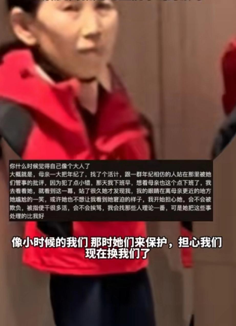 1月27日,陕西。女子下班了。妈妈也在这个时候下班,便想去接她。顺便看看妈妈工作的地方。 女子去的真不是时候。因工作犯了点错,妈妈和几个年龄相仿的人站在一起,被领导批评。看到妈妈都是年纪一大把的了,还像个犯了错的幼儿园的孩子一样被训。女子心里真不是个滋味。 妈妈垂着头,默默的听着领导的训话。忽然发现了女儿,显得很尴尬,局促不安的搬弄手指头。 孩子在成长,从朦胧无知,直到知道父母为了家含辛茹苦,决定自己为家作出贡献,也就是长大成人了。女子忽然觉得自己成了大人了。她在想,小时候觉得父母是一片天,在保护我们。现在我们已经长大了,成了大人了,应该换作我们把这片天撑起来。 女子看到妈妈被训斥像个犯错的孩子孩子成长 你什么时候觉得自己像个大人了